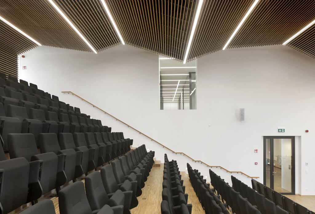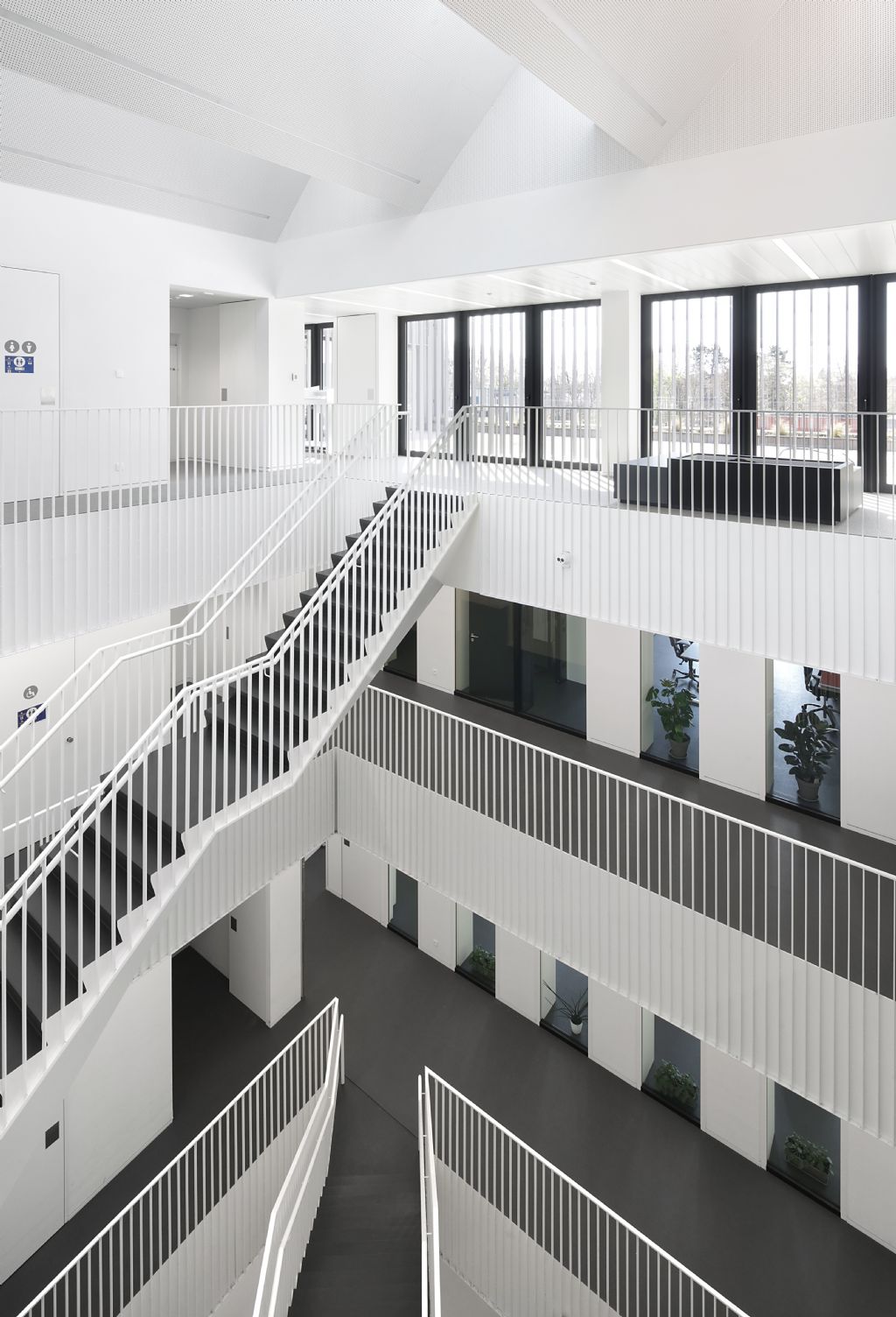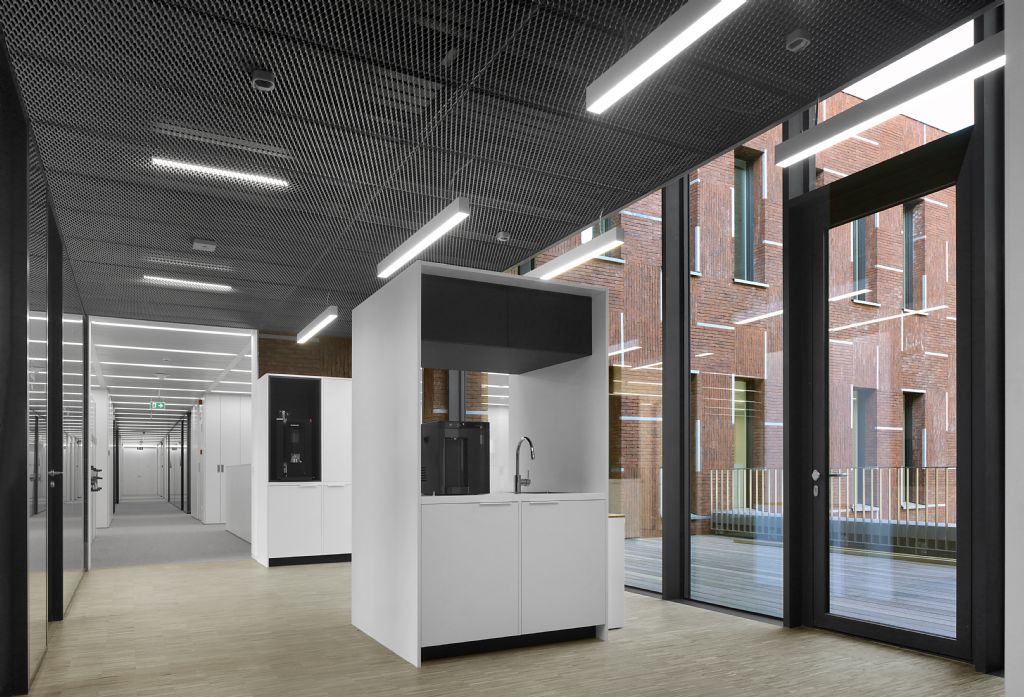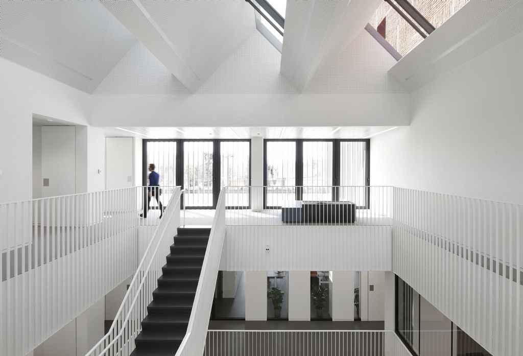 Het gebouw is eenvoudig en goed georganiseerd. De ‘mega-baksteen’ bekleding beantwoordt aan de lokale context: een traditioneel bouwmateriaal toegepast op een niet-traditionele manier. Regelmatig geplaatste verticale ramen passen in het baksteensysteem waardoor voorspelbaar licht de flexibele interne kantoorindelingen kan binnentreden. Uitgespannen metaal (gaaswand) bekleedt de lege ruimten tussen elk volume en contrasteert met de rationele bakstenen gevel. Deze vides definiëren binnenpleinen, brengen daglicht tot diep in het gebouw, moduleren de zonnewarmte en creëren functionele buitenruimtes. Transparante verbindingen tussen de volumes bevatten alle verticale circulatie en gemeenschappelijke ontmoetingsruimten.
