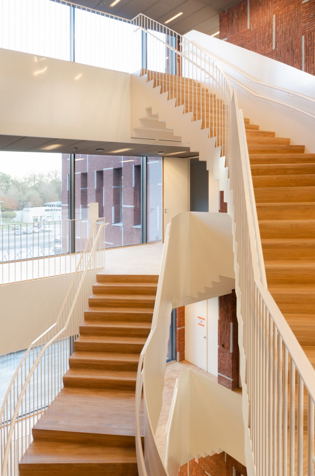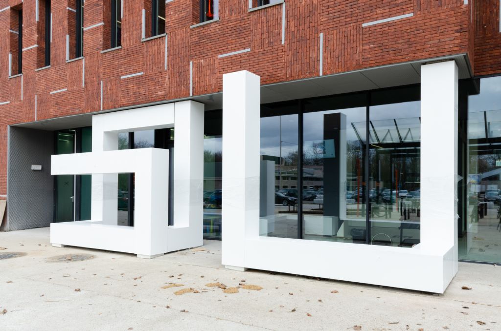 De noodzakelijke kolommen langs de gevel werden ook als architecturale elementen opgevat. Ze buigen en plooien zich en doen dienst als banken, brievenbussen en ticketzuilen. De vormen verwijzen naar kunstwerken van beeldend kunstenaar Sol LeWitt. “In zowat elk project trachten we de kolommen op een creatieve manier op te lossen. Door ze hier te verstoppen in 3D-sculpturen vallen ze niet meer op en creëren we een soort van trompe-l’oeil. We hebben hier een op het eerste zicht vrij gestandaardiseerd gebouw neergezet, maar deze 3D-sculpturen verlenen het gebouw toch een uitgesproken identiteit, net als de voluptueuze trapstructuur en de gaaswand”, aldus Alexander D’Hooghe.