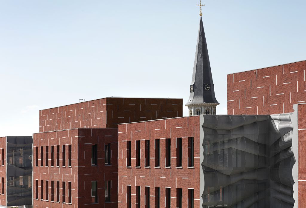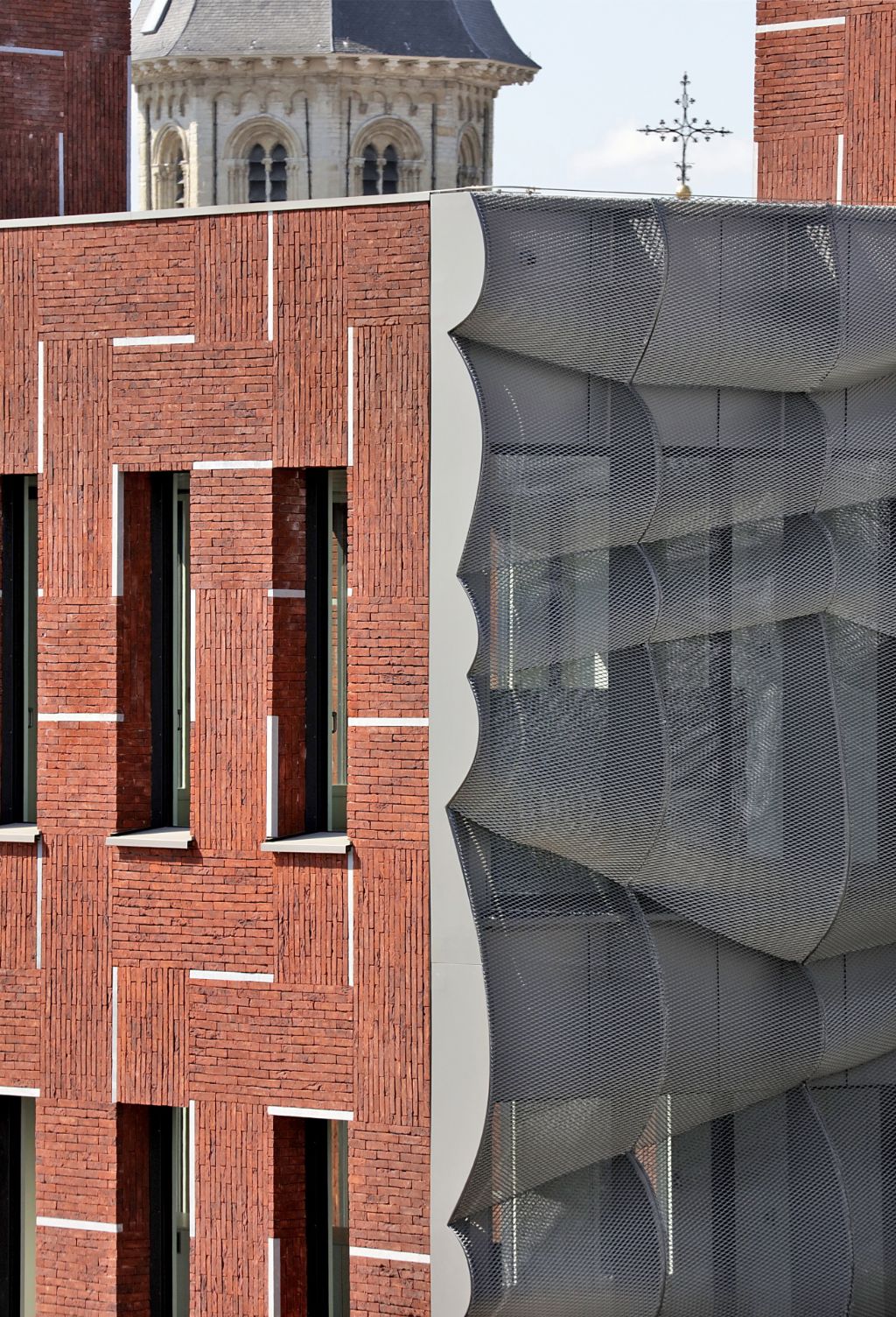 “Het gebouw is samengesteld uit honderden identieke elementen op het niveau van het menselijk lichaam, met afmetingen van 1,6 op 0,8 meter, maar die geschakeld worden op een manier die stelselmatig grotere korrels maakt. Het gebouw is eigenlijk veel te groot voor het centrum van Beveren, dat een relatief fijnkorrelig dorpje is. We hebben gewerkt met verschillende schaalniveaus om het gebouw in het stadsweefsel te laten inpassen”, licht Alexander D’Hooghe toe.