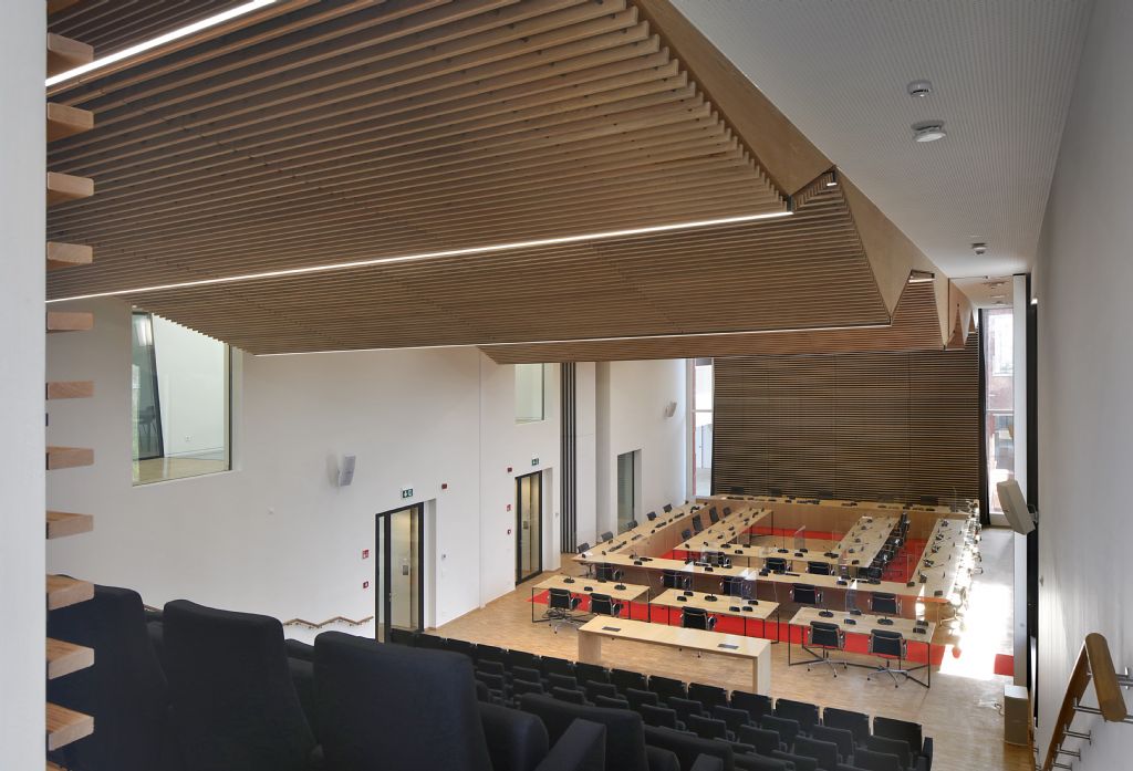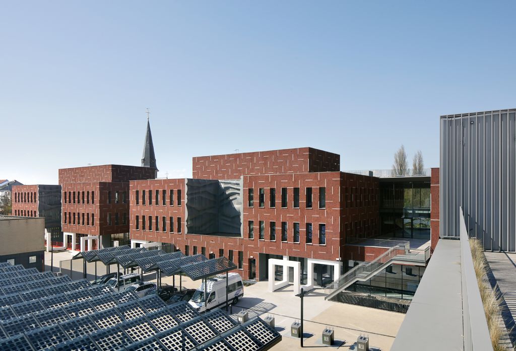 De strategische positionering van het gebouw resulteerde in een compact L-vormig gebouw. Het politiekantoor en het administratief centrum zijn elk in één been van het gebouw ondergebracht. Op het kruispunt van beide benen is een toegangsvolume vormgegeven, als een soort van anomalie in het verder eerder gestandaardiseerde gebouw. Dit volume bevat de representatieve functies van het centrum: de gemeenteraadszaal, een auditorium en publieke dienstenmarkt. De voorgevel opent zich naar en definieert een nieuw evenementenplein.