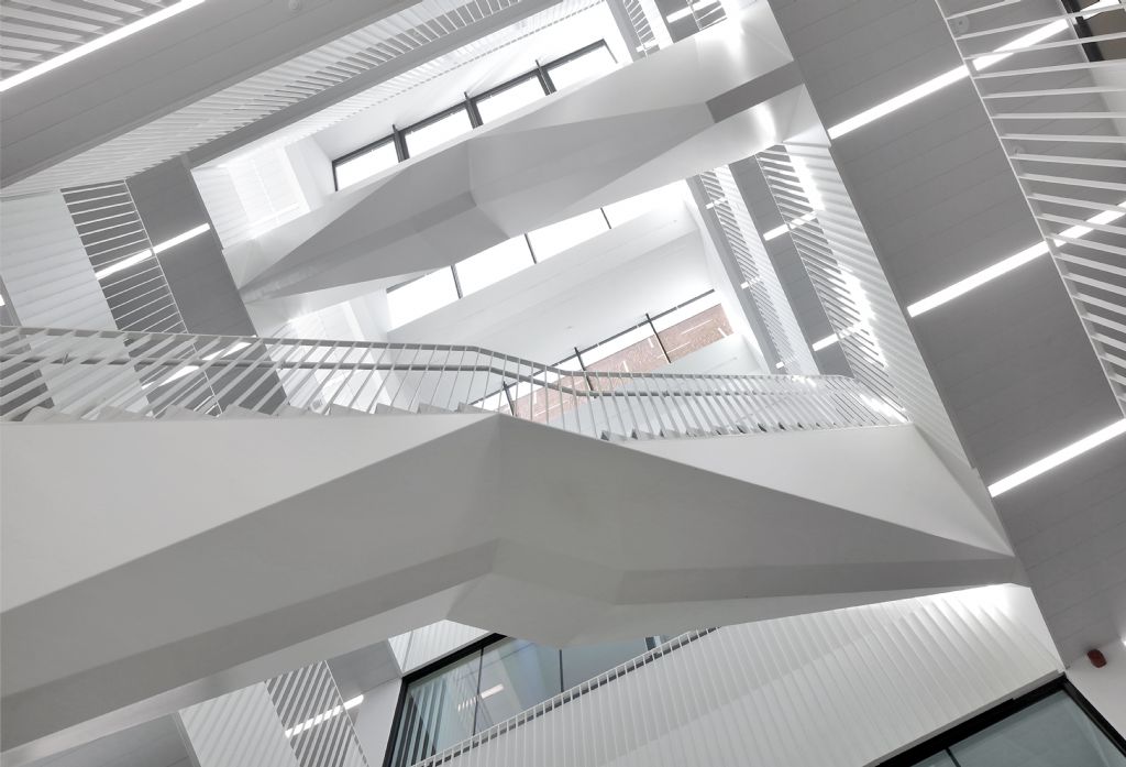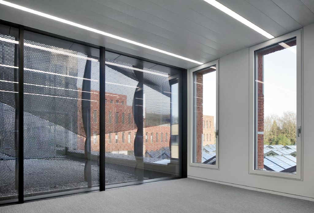 Uitgerekte metalen panelen worden gedeeltelijk in vorm gebogen voordat ze volledig gevormd en bevestigd worden aan staalplaatprofielen, die met stalen beugels opgehangen zijn aan de betonnen vloerplaten. De vorm, oorspronkelijk geïnspireerd op een horizontaal georiënteerd stoffen gordijn, dwingt het licht meer dan eens door de golving van elk paneel te gaan, waardoor de directe warmte-instraling wordt geminimaliseerd.