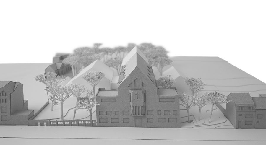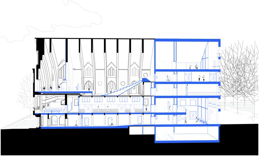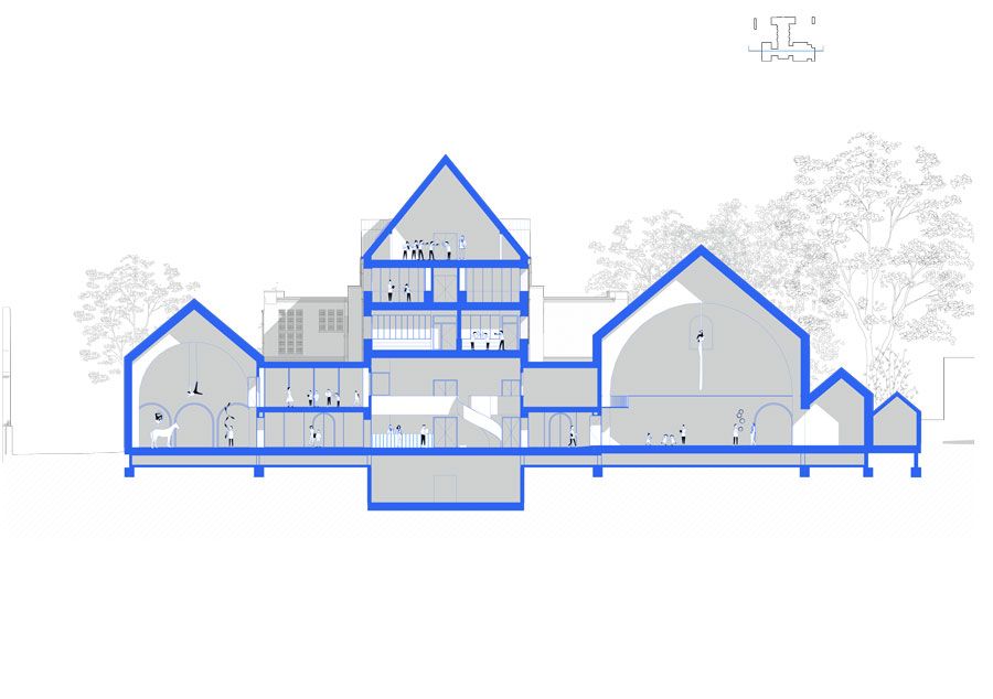 Het ontwerp zoekt een harmonieuze overgang tussen nieuw en oud, tussen ruimtelijk en functioneel. In plaats van een vooropgelegd programma geforceerd in een bestaande structuur te duwen, realiseert het ontwerp een gebruik dat past bij het bestaande gebouw en tegelijk aansluit bij de nieuwe functie. Zo krijgt onder andere de statige kapel boven in het Broosgebouw een nieuwe invulling als polyvalente tribunezaal.