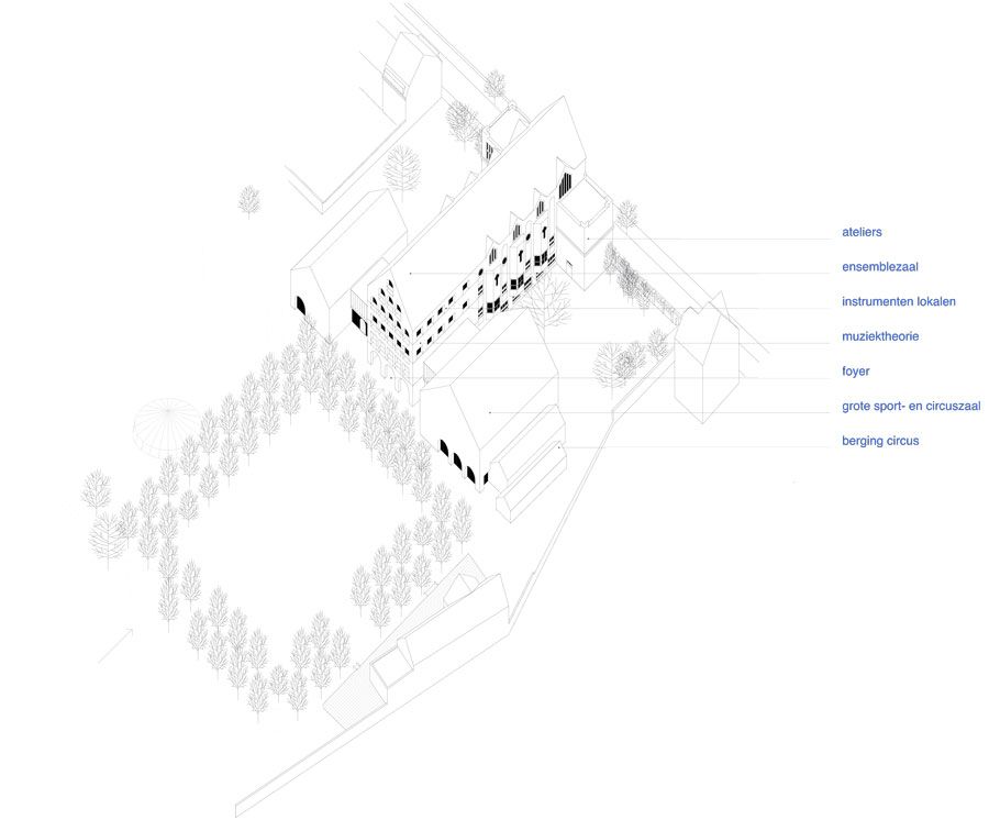 Het project zoekt synergieën in ruimtegebruik en programma op. Doordachte plaatsing van circulatie en logische stapeling van functies zorgen voor inspirerende (visuele) relaties of afsluitbaarheid tussen werkingen, naargelang de wensen van het moment. Een dubbelhoge transparante foyer fungeert als kern van het centrum, waar verschillende organisaties, leerlingen en buurtbewoners elkaar tegenkomen.