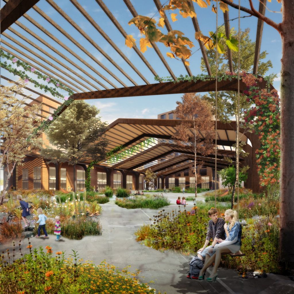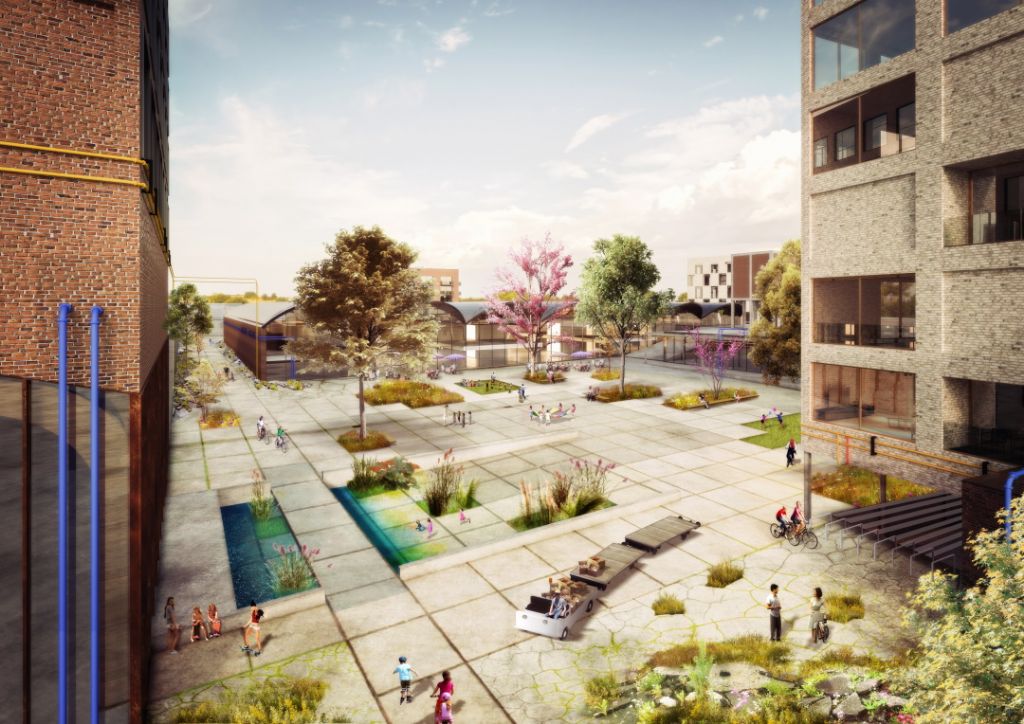 “We ontwikkelden vanuit de bestaande hallen een masterplan, waarbij de hallen de bouwblokken vertegenwoordigen”, vertelt Frederik Vaes van UAU collectiv. “We verwerkten de thema’s wonen, werken en leren in ons programma en entten die op de bestaande loodsen. Het is een uniek project in Vlaanderen. Meer dan 15 hectare onversnipperde grond – 32 voetbalvelden! – in een centrumzone waarop je je gang mag gaan, dat kom je als architect niet vaak tegen. Dat je in je ontwerp plaats moet voorzien voor appartementen, woningen, winkels, groen (synergiën tussen) scholen en kmo’s ook. Maar vooral dat er zal gewerkt worden met woonrechten in plaats van individuele eigendommen en een nieuwe vorm van financiering, is bijzonder. Eigenlijk primeert die strategische keuze op de architectuur.”