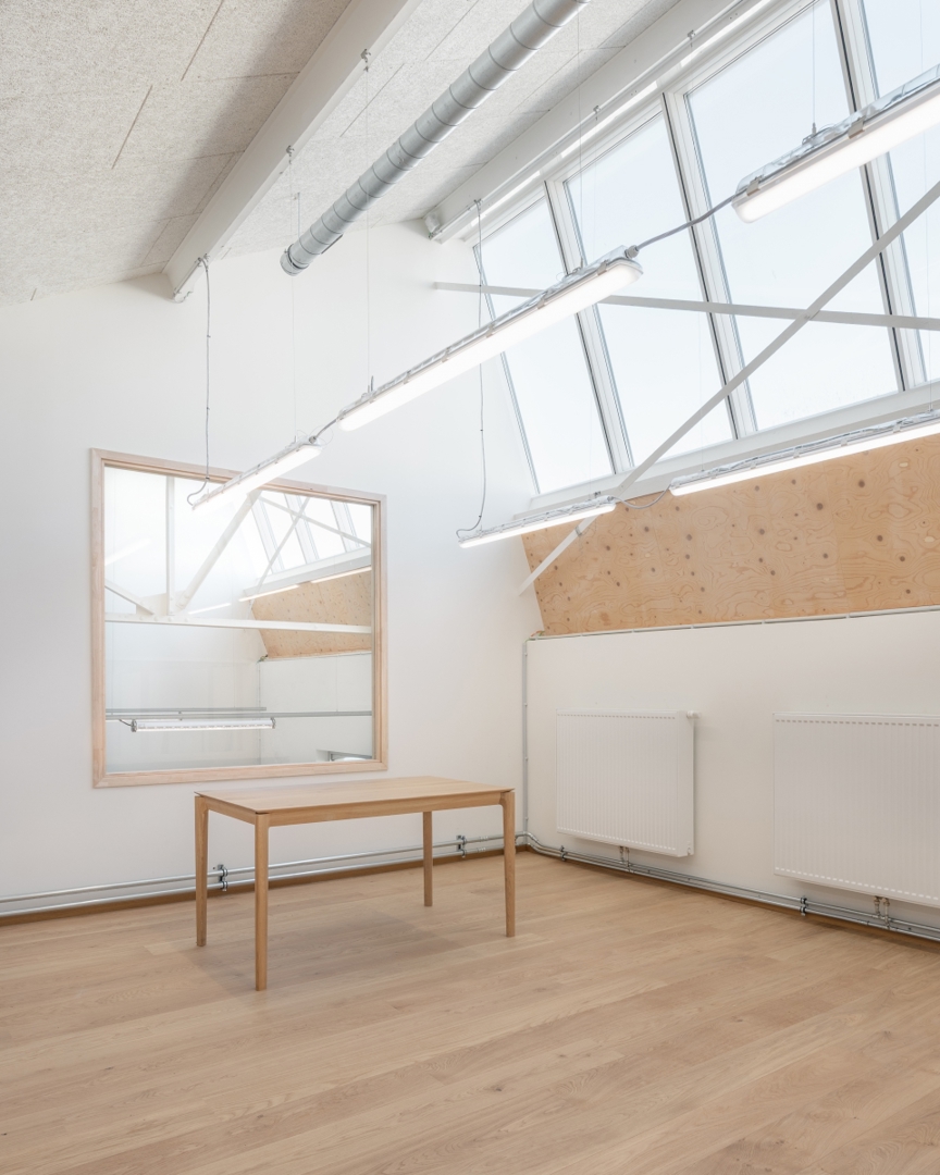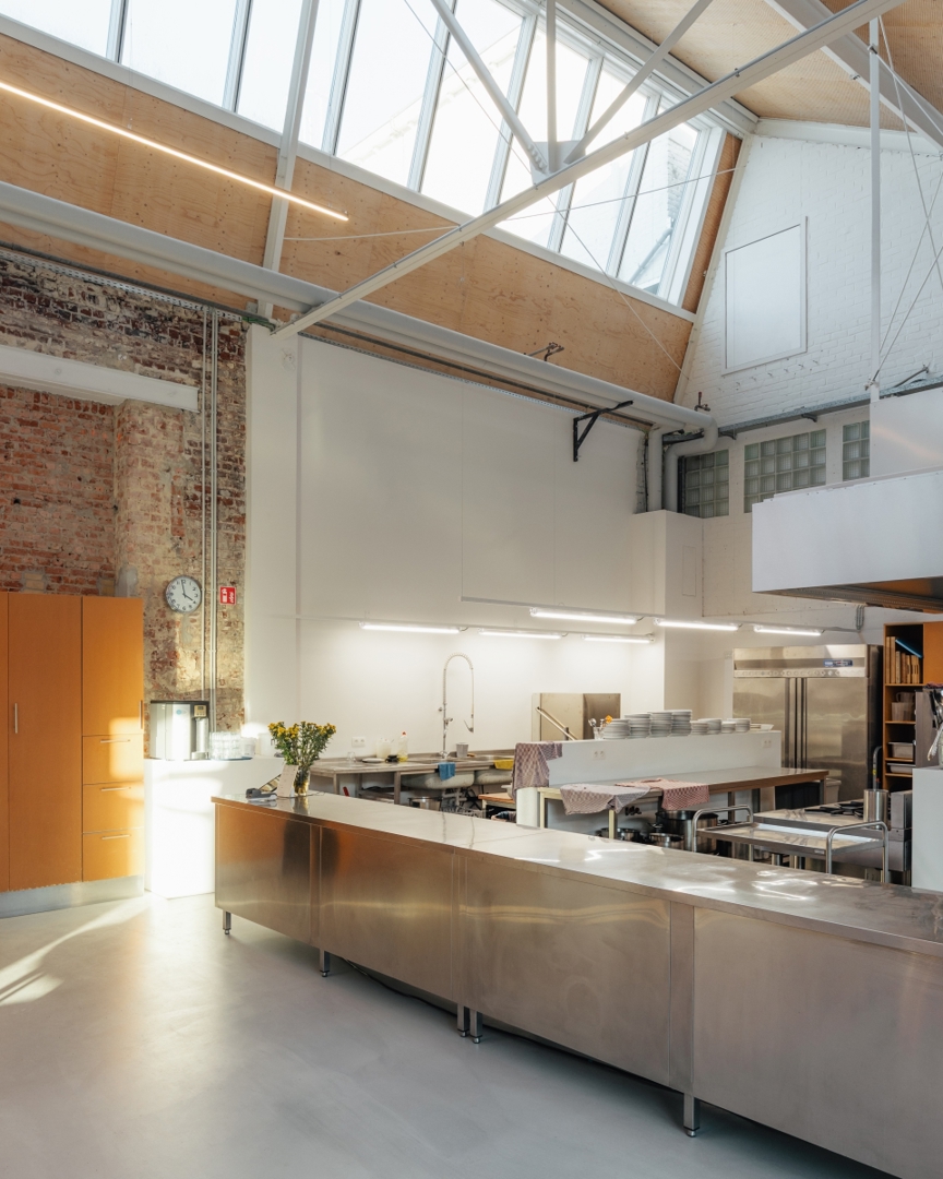 Het voormalige pakhuis – de zogenaamde Blanchisserie – kreeg een sleutelrol. Door het verwijderen van een vloerplaat ontstond een hoge, door zenitaal licht verlichte ruimte die vandaag dienstdoet als ‘social wing’. Cafetaria, informele werkplekken en ontmoetingsruimtes maken er het kloppende hart van de campus van. Het no-nonsensekarakter van het industriële volume laat een flexibele invulling toe, aangepast aan repetities, toonmomenten of gezamenlijke maaltijden.