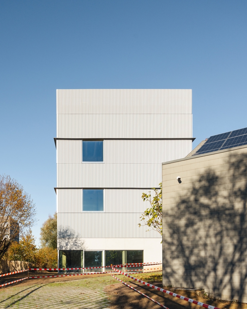 Voor P.A.R.T.S. werden vier nieuwe dansstudio’s toegevoegd, deels aansluitend bij de bestaande Rosas Performance Space. Drie studio’s werden verticaal gestapeld, wat resulteert in een compacte footprint en maximaal behoud van open ruimte. De hoogste studio, met een vrije hoogte van zes meter, biedt royale proporties en grote raampartijen met uitzicht op de tuin en de Brusselse skyline. Daglicht en zicht worden expliciet ingezet als onderdeel van het creatieve klimaat.