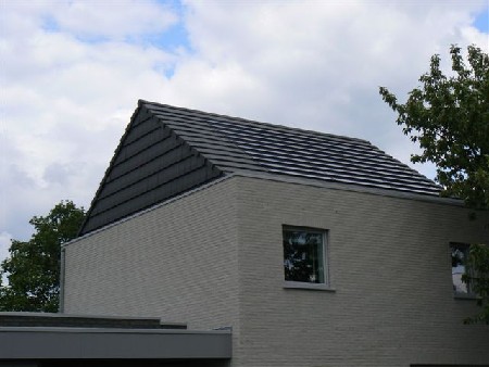 • dakbedekking: Migeon Actua (antracietkleurige matte vlakke dakpannen) en fotovoltaïsche zonnepanelen KoraSun
