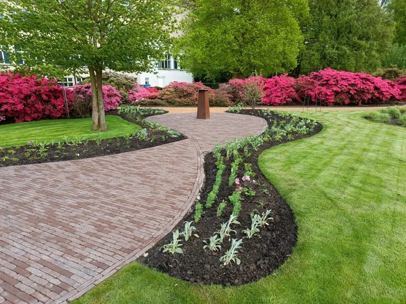 De verharding in de Passietuin is speels en vloeiend ontworpen, wat een mooi contrast biedt met de strakke lijnen van de aangrenzende Droomtuin. Dit ontwerp benadrukt de esthetische aantrekkingskracht van de tuin en maakt het een uitnodigende ruimte voor zowel leerlingen als bezoekers.