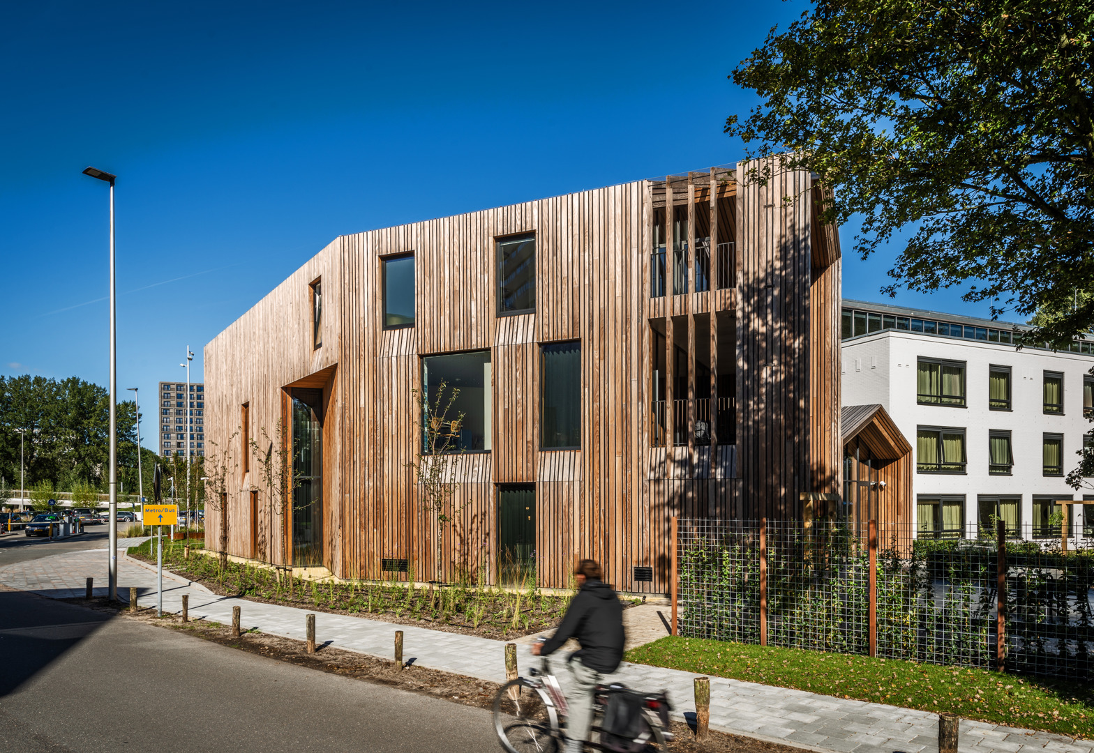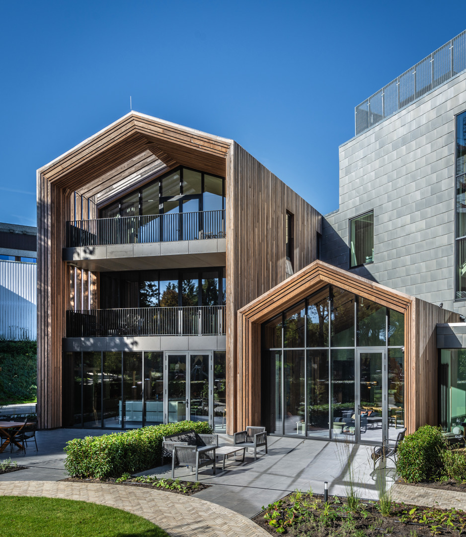 Het project blinkt bovendien uit op het vlak van circulariteit, waarbij materialen uit het gesloopte gebouw werden hergebruikt en het pand volledig gasloos is uitgevoerd. De houten bekleding is geïntegreerd in een ontwerp dat ook aandacht heeft voor de ondersteuning van biodiversiteit, bijvoorbeeld door het plaatsen van nestkasten voor gierzwaluwen en vleermuizen. Deze toevoegingen dragen samen met de keuze voor duurzame materialen bij aan een toekomstbestendig project dat zorg, architectuur en ecologie op een evenwichtige manier samenbrengt.
