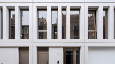 Simon Ducreu, zaavkvoerder van Coldefy: “Voor alle constructieve elementen werd glad, wit en zuiver, gepolijst beton gebruikt. Het materiaal krijgt het uiterlijk van steen met zichtbare aggregaten, wat ook een lichtspel in de gevel toelaat. Niet alleen de gevelelementen zijn gemaakt van geprefabriceerd beton, maar ook alle binnenwanden, waardoor het mogelijk was om de etages zeer snel, met grote precisie en bijna in een droog proces uit te voeren.”