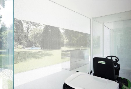 Het pavilioen combineert filtersysteem, douche, kleedkamer, toilet en een garage voor een grasmaaier op 25m². Doorgaans hebben plaatsen met dergelijke functies nood aan verbergende oppervlakken.