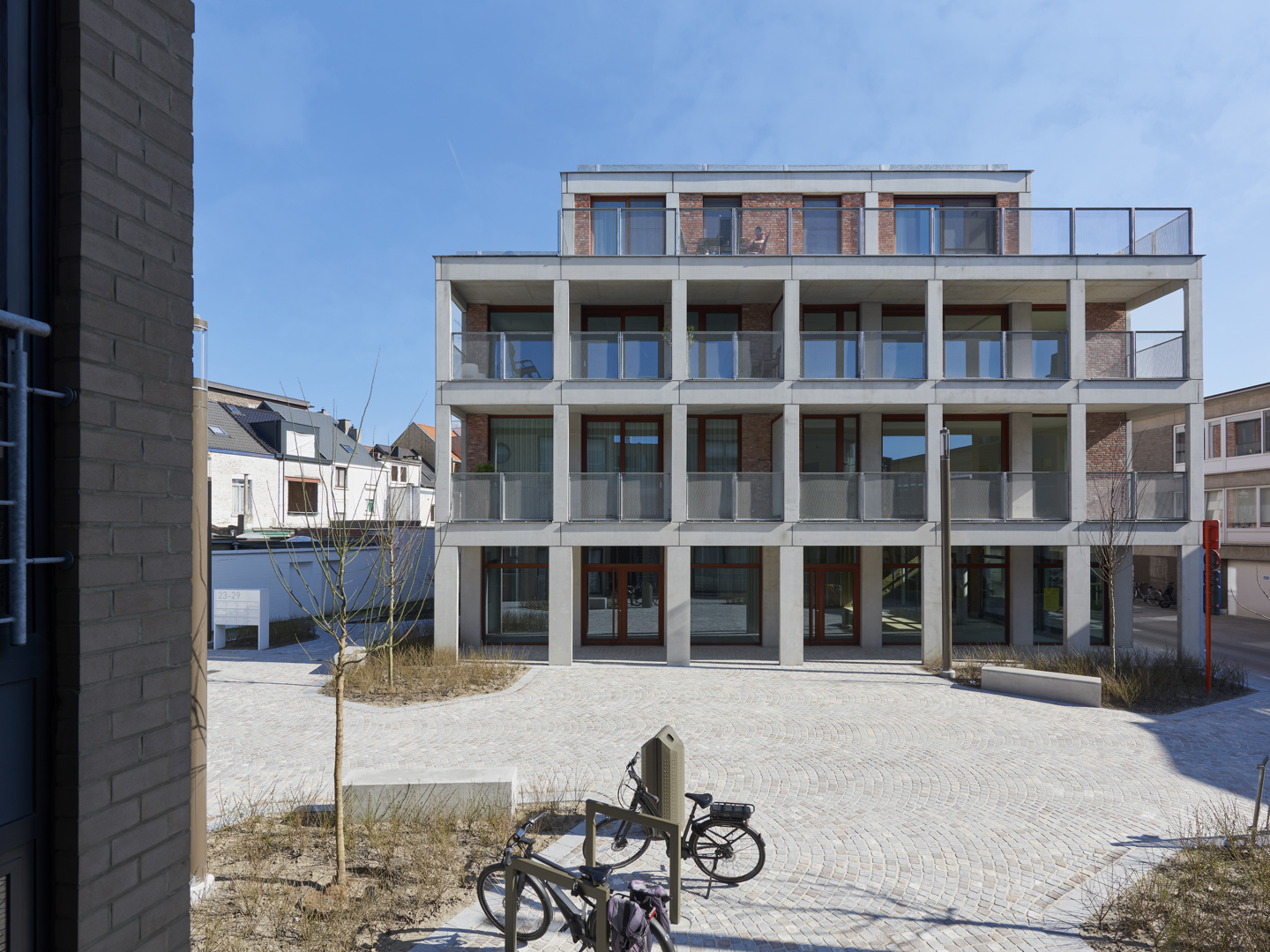 Een open groene ruimtestructuur vormt de ruggengraat van het ontwerp. Deze structuur verbindt de nieuwe toevoegingen met de bestaande open ruimten in het bouwblok. Door te werken met diverse volumes, afgestemd op het bestaande stedelijk weefsel en het vroegere bibliotheekvolume, ontstaat een gelaagde, goed geïntegreerde compositie. Elk volume heeft een eigen architecturale uitstraling en materiaalgebruik, wat zorgt voor herkenbaarheid én samenhang.