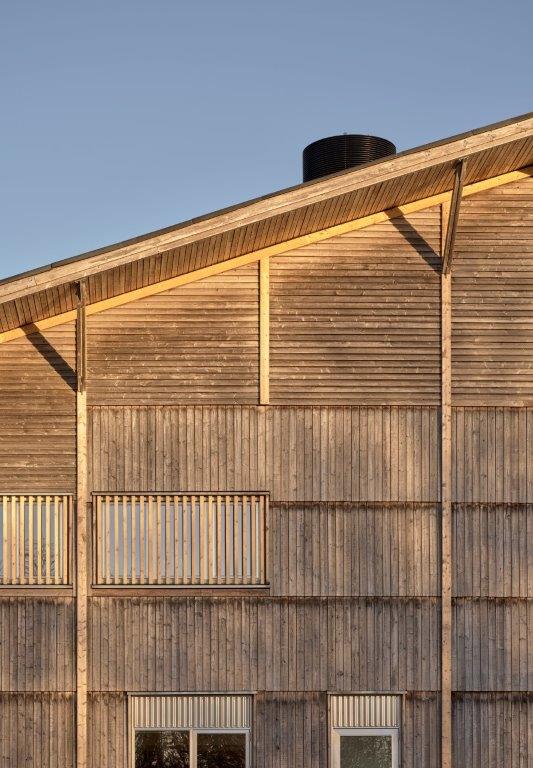 Een ander indrukwekkend cijfer: door resoluut in te zetten op hergebruik kon VELUX Group 55% – oftewel 4,576 ton – materiaal besparen in vergelijking met de realisatie van een nieuwbouw met dezelfde omvang, vorm en functie. Zo werden de originele houten façades zorgvuldig gedemonteerd, gestockeerd en vervolgens naadloos geïntegreerd in het nieuwe geheel. “Waar nodig hebben we nieuwe gevelbeplanking toegevoegd, maar dat onderscheid tussen oud en nieuw hout zal mettertijd automatisch verdwijnen onder invloed van natuurlijke vergrijzing”, verzekert Mette Tony. “Ook de bestaande betonnen vloer is behouden, inclusief gele markeringen, strepen en vlekken. Dat geeft extra karakter en is een leuke knipoog naar de vroegere functie van dit complex.”