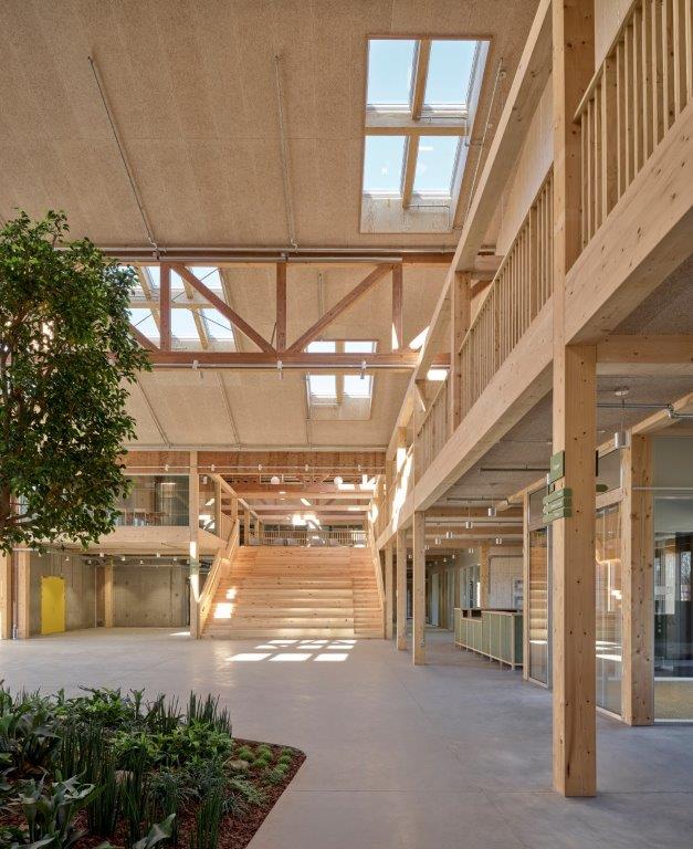 Een cruciale architecturale ingreep was het ‘opentrekken’ van het drieledige loodsvolume, dat voordien een erg gesloten karakter had. Zo zijn er tal van grote raampartijen en 415 elektrisch gestuurde VELUX-dakramen geïntegreerd, die voor een rijkelijke natuurlijke lichtinval en een optimale binnenluchtkwaliteit (via efficiënte natuurlijke ventilatie) zorgen. Bovendien zijn er midden in het complex twee grote volumetrische uitsnijdingen gemaakt, die vandaag dienstdoen als groene binnentuinen. Deze laatste zijn omzoomd door grote raampartijen, waardoor de connectie met de buitenwereld en de omringende natuur eens zo sterk is.