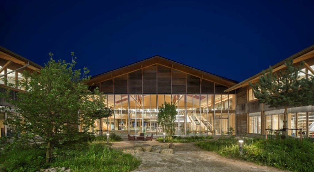 Wie VELUX Group een beetje kent, weet dat een holistisch perspectief op duurzaamheid altijd al deel heeft uitgemaakt van het bedrijfs-DNA. De realisatie van het LKR Innovation House kwam dan ook niet uit de lucht vallen. De kiem voor dit vooruitstrevende project werd al gelegd in 1993, toen Lars Kann Rasmussen – de toenmalige CEO en zoon van oprichter Villum Kann Rasmussen – op de Interbuild-bouwbeurs in Birmingham geïnspireerd raakte door een visionaire keynote speech, waarin houtbouw naar voren werd geschoven als essentiële oplossing om onze planeet te redden. Sindsdien is CO2-reductie bij VELUX een van dé speerpunten binnen de bedrijfsvoering, wat in 1995 al meteen uitmondde in een eigen ‘houtbouwexperiment’ in Østbirk. Daar verrees in een mum van tijd een industrieel complex met drie loodsen die grotendeels uit onbehandeld hout uit verantwoord beheerde Deense en Zweedse bossen bestonden.