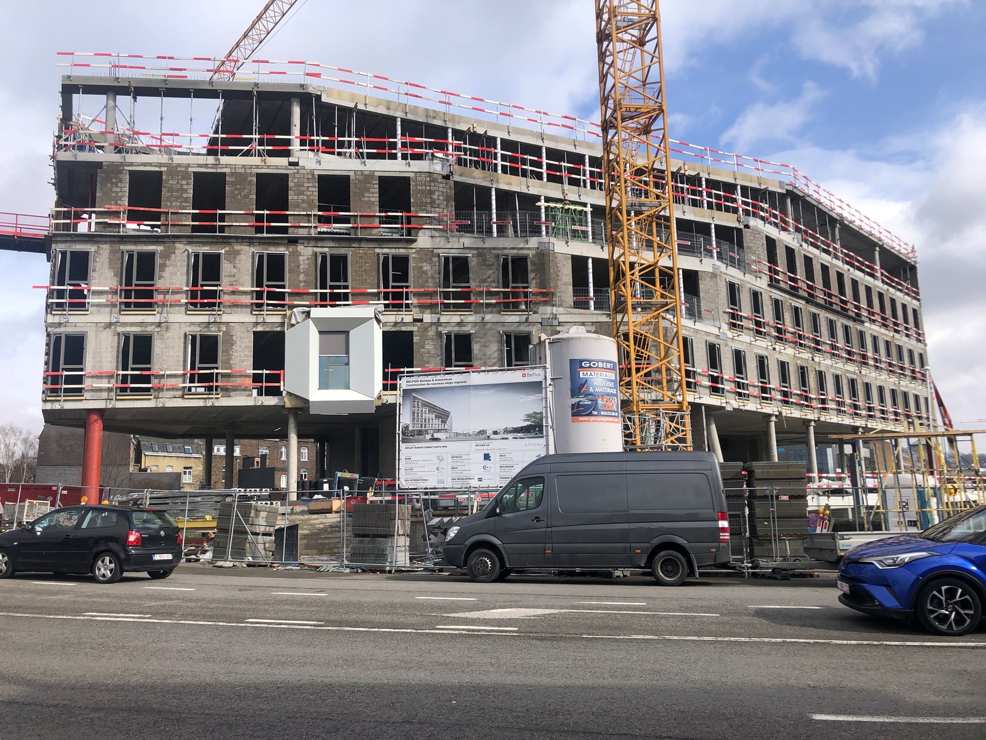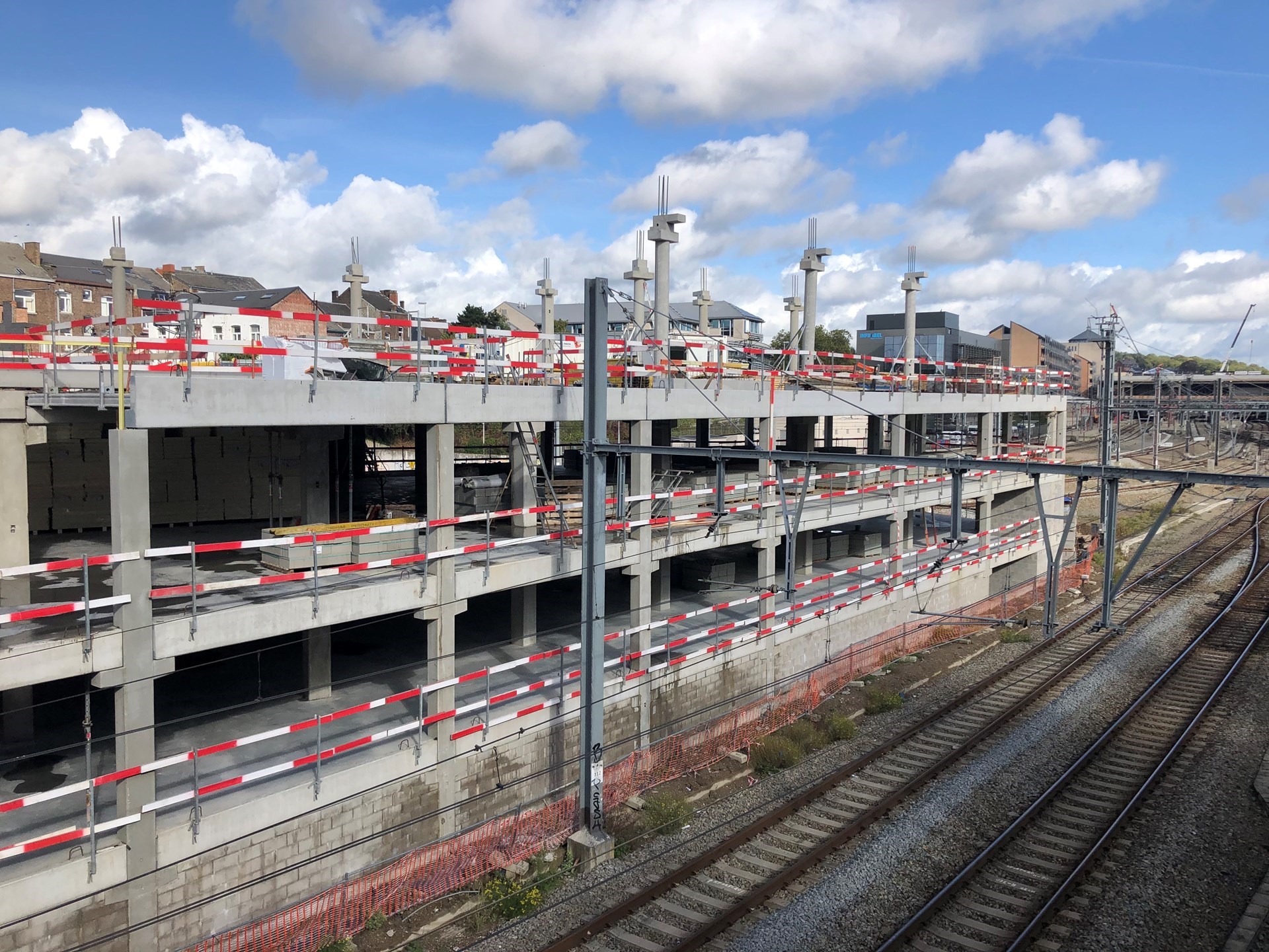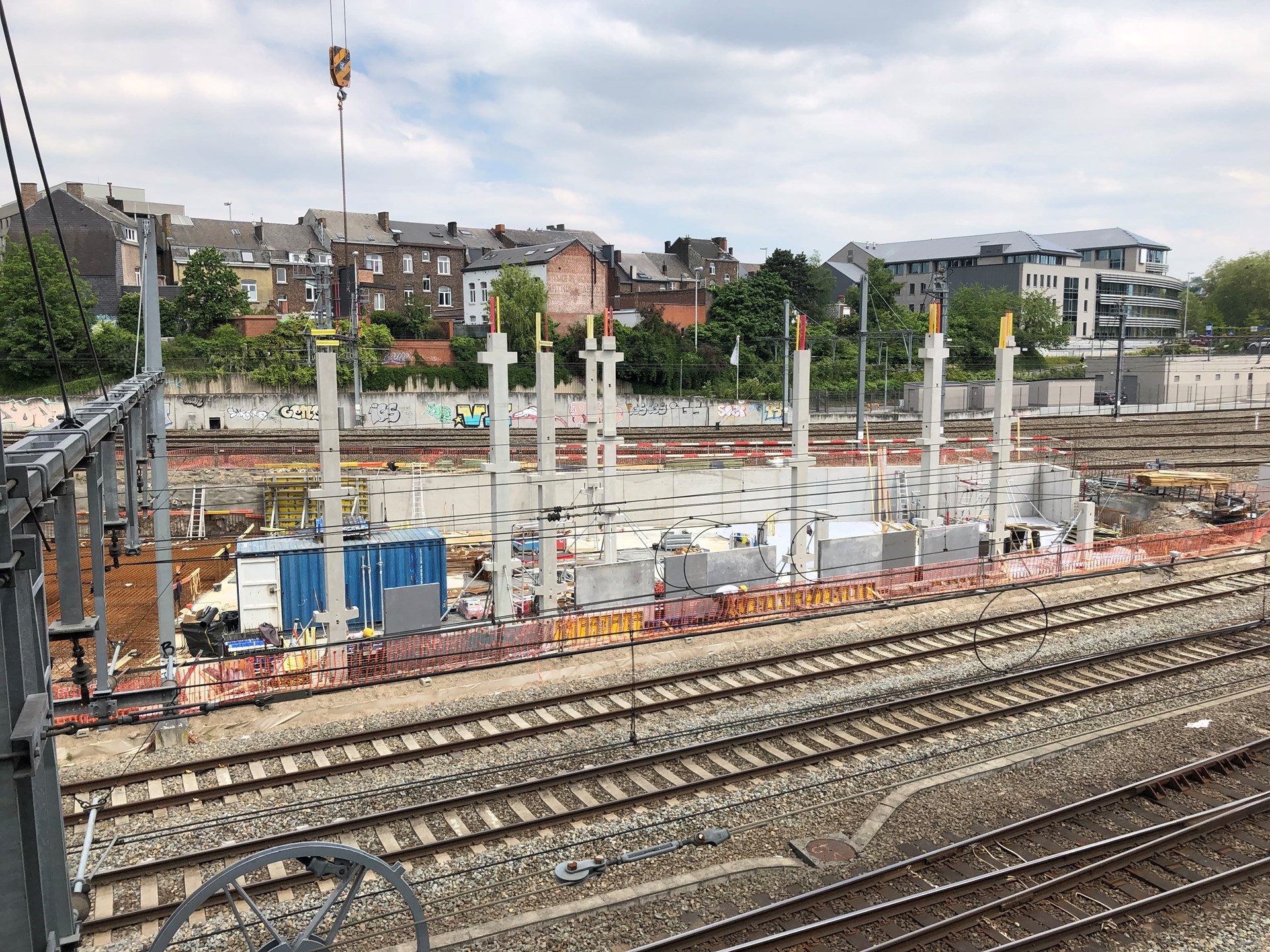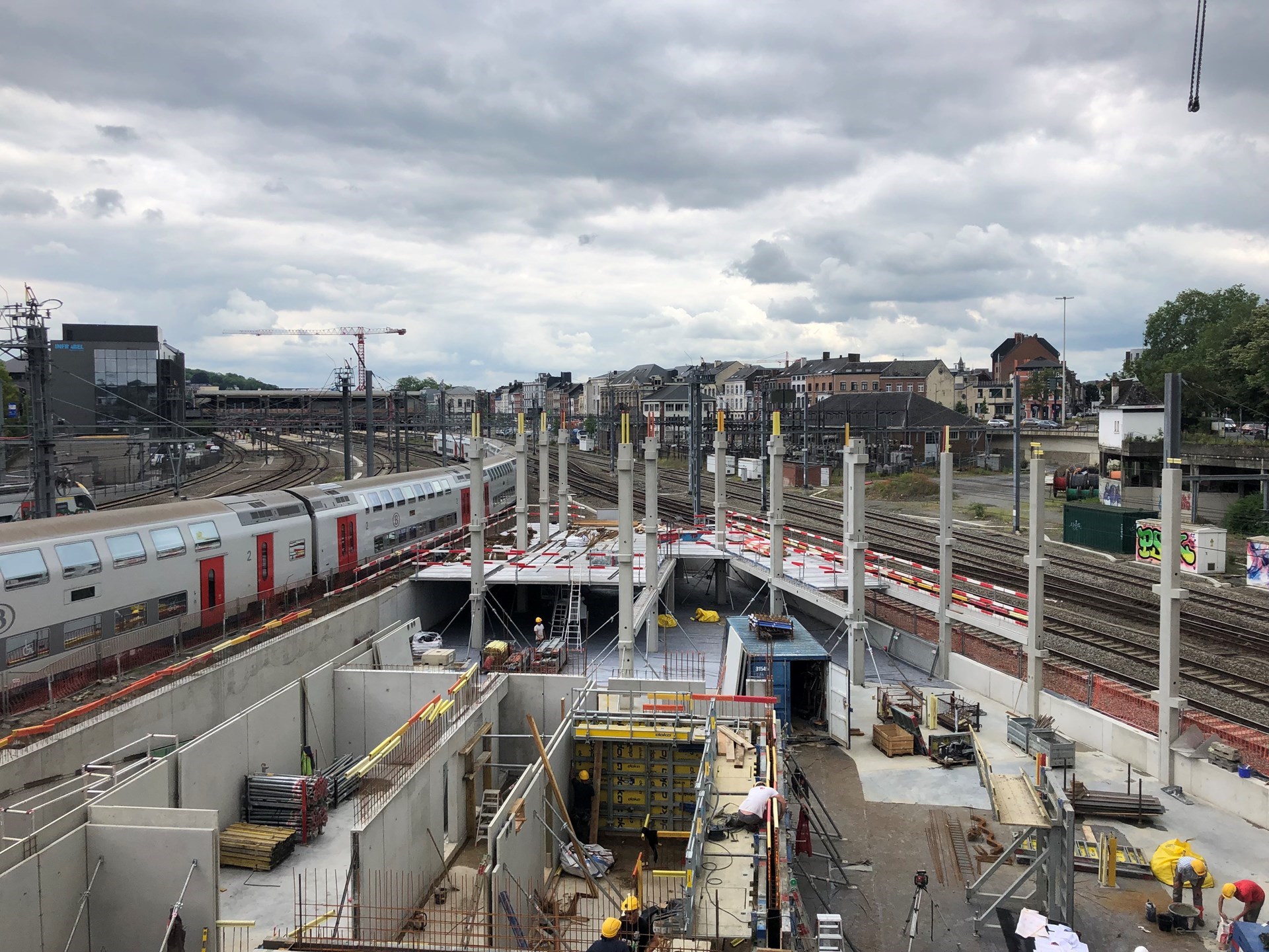 Zodra Thomas & Piron Bâtiment was aangesteld als hoofdaannemer, werd het project samen met BAEB enkele weken grondig bestudeerd. Daniel Martin, projectarchitect: "De werf op voorhand voorbereiden is heel belangrijk, want iedere partner heeft zijn eigen gewoontes. Een van de problemen die we bijvoorbeeld moesten oplossen, was de plaatsing van de kraan, die op de overloop van de parking moest worden geplaatst (waar ook de holle vloerelementen werden opgeslagen) om de hele bouwplaats tussen de sporen te kunnen bereiken. De toegang tot de bouwplaats was gedurende de hele werfperiode een obstakel, omdat het vrijwel onmogelijk was om materialen op de bouwplaats te stockeren. Leveringen werden just-in-time georganiseerd, waarbij vrachtwagens in de hoger gelegen deelgemeente Suarlée wachtten voordat ze – na een signaal van de werfleider – naar de bouwplaats afdaalden om te lossen.”