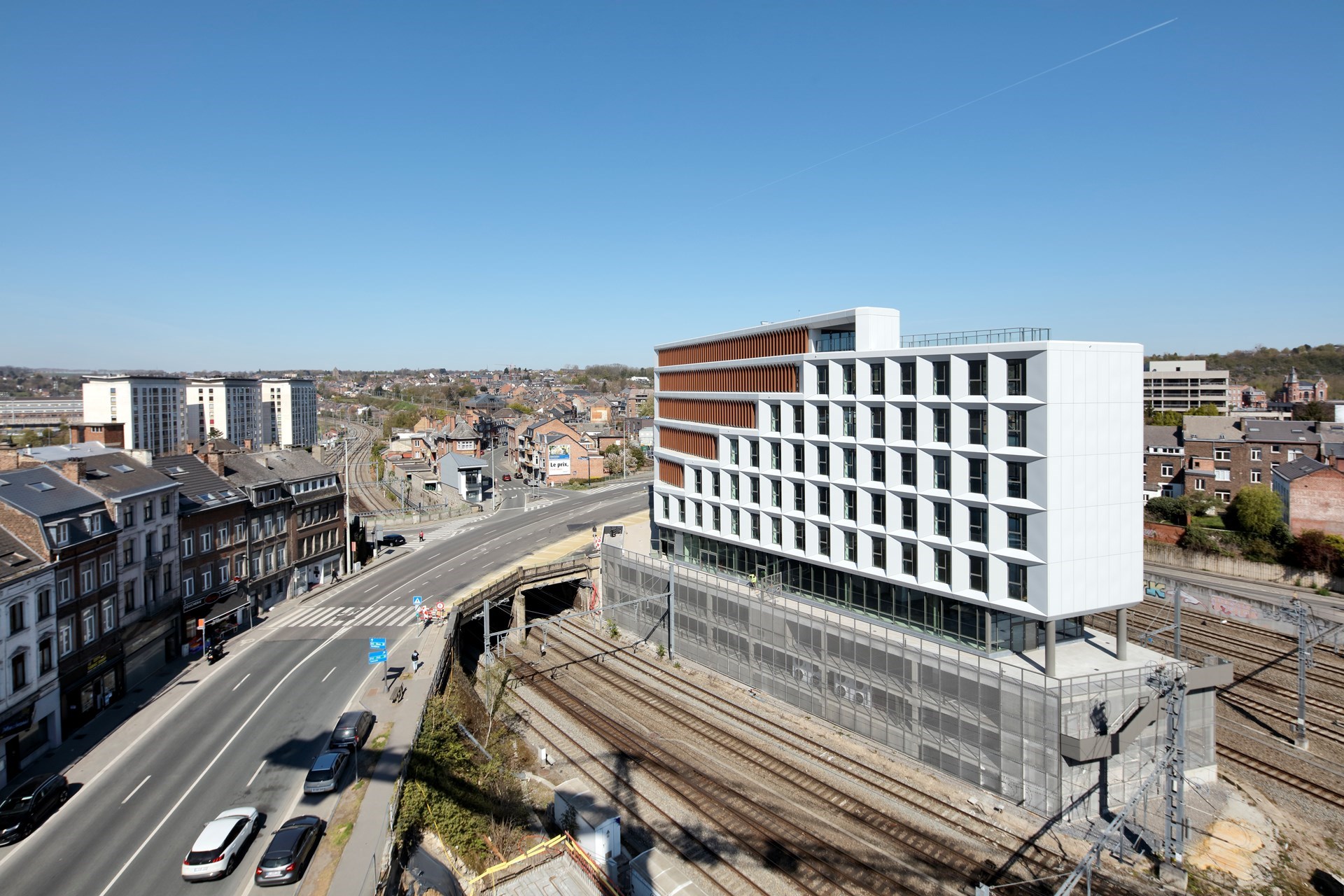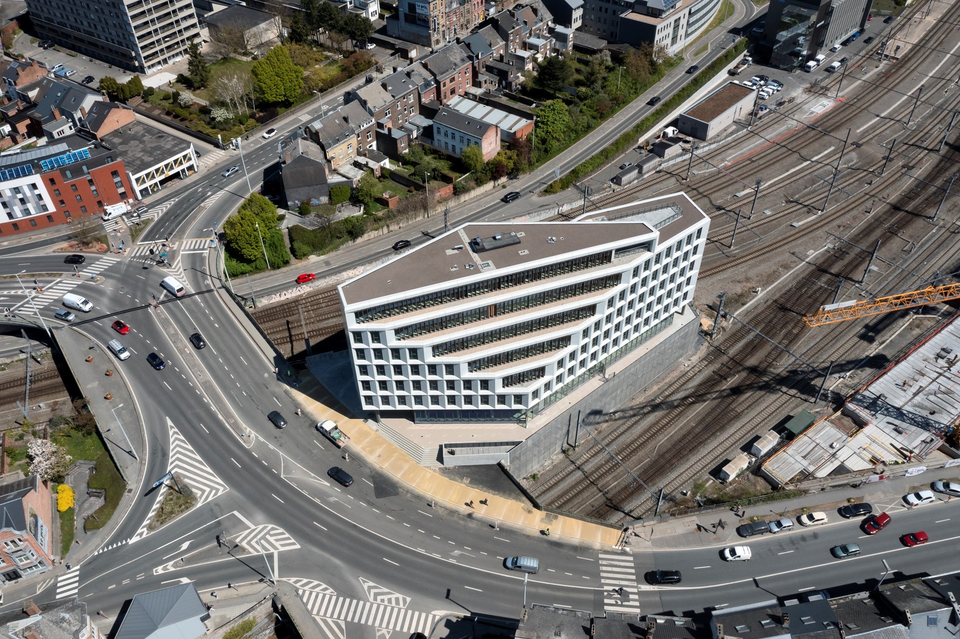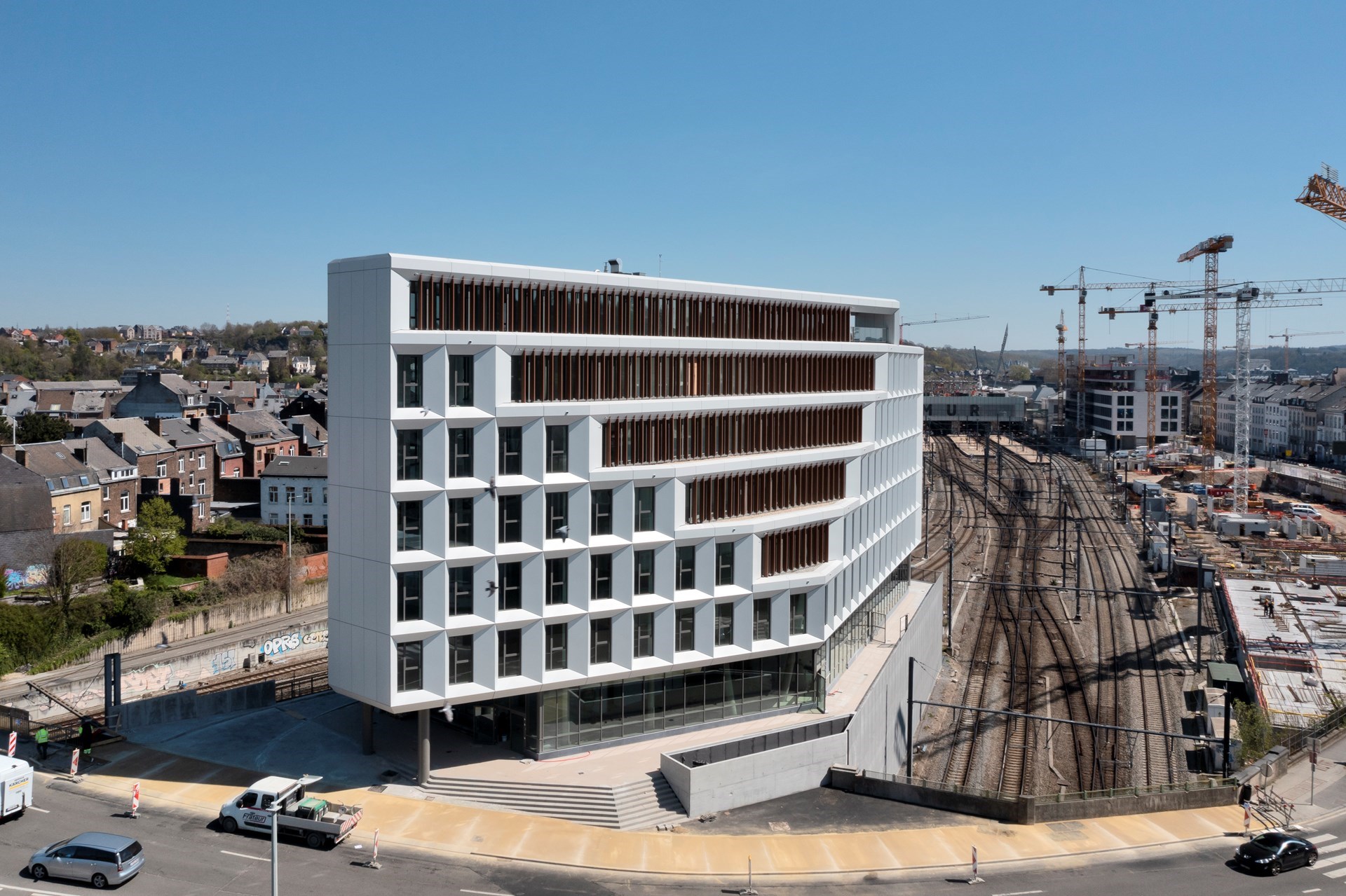 Na een bouwperiode van twee jaar ligt het nieuwe Waalse vlaggenschip van Belfius nu in het station van Namen. Het kantoorgebouw van 6.000 m² (verspreid over zeven bovengrondse niveaus) werd gebouwd door Thomas & Piron Bâtiment sa, in opdracht van de ontwikkelaars ARTONE sa en het Franse herontwikkelingsfonds Brownfields, op een semi-ondergrondse parkeergarage van drie niveaus. De opvallende gevel valt op door de continue en repetitieve combinatie van beglazing en aluminium, maar het is uiteraard de geprefabriceerde betonstructuur waar we in dit artikel verder op inzoomen.