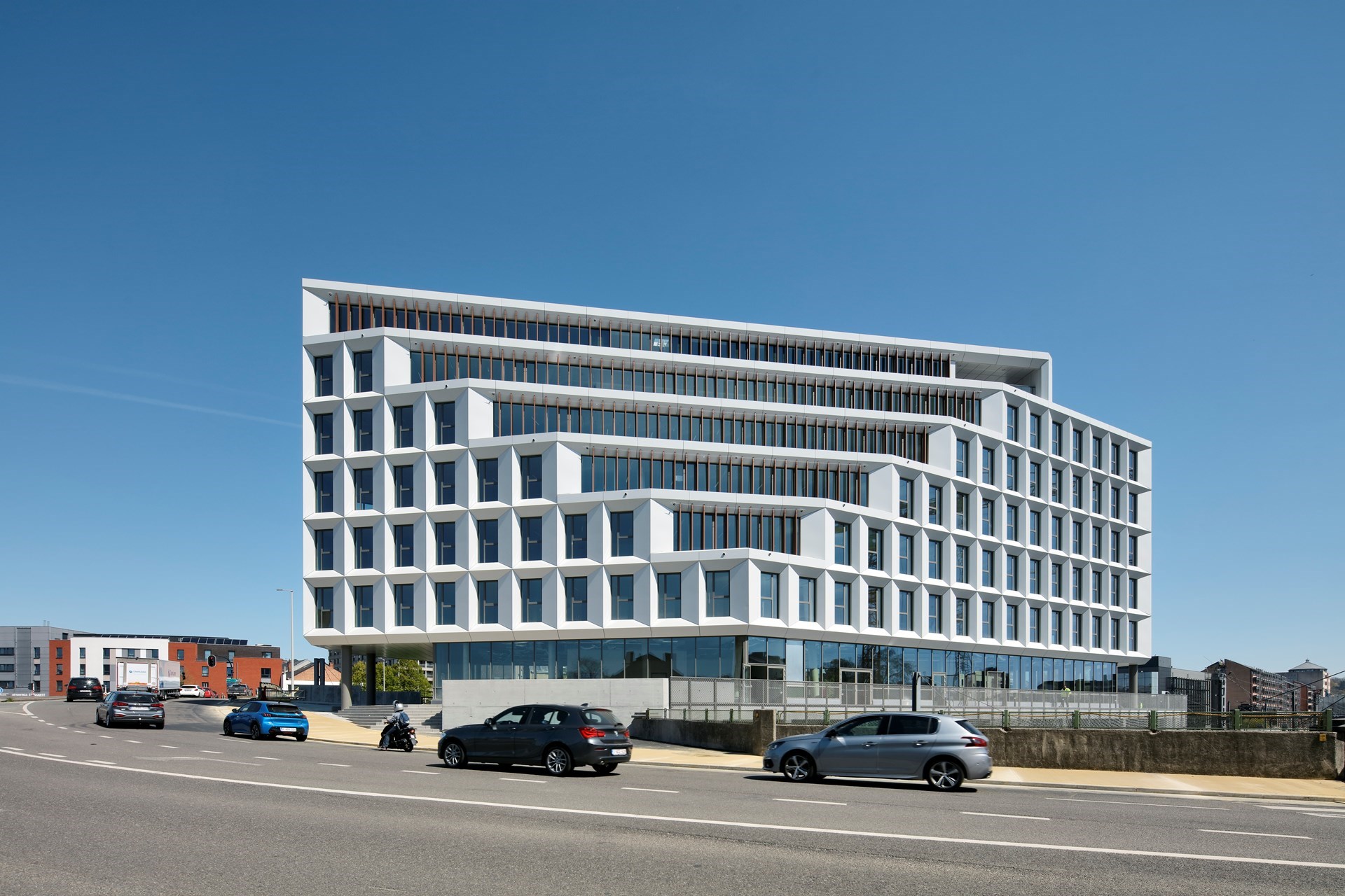 Om terug te komen op het project in Namen: de architecten wilden een zo duurzaam en circulair mogelijke oplossing vinden, tegen een redelijke prijs en met behoud van een kenmerkende architectuur voor een gebouw dat fungeert als een wegwijzer aan de poort van het stadscentrum. Het is intussen vijf jaar geleden dat het Waalse hoofdkantoor van Belfius werd ontworpen. Op een moment dat er nog grote stappen genomen moesten worden op het vlak van decarbonisering van de betonproductie. De duurzaamheidsgedachte focuste zich daarom logischerwijs op de flexibiliteit van het gebouw om de levensduur te verlengen.