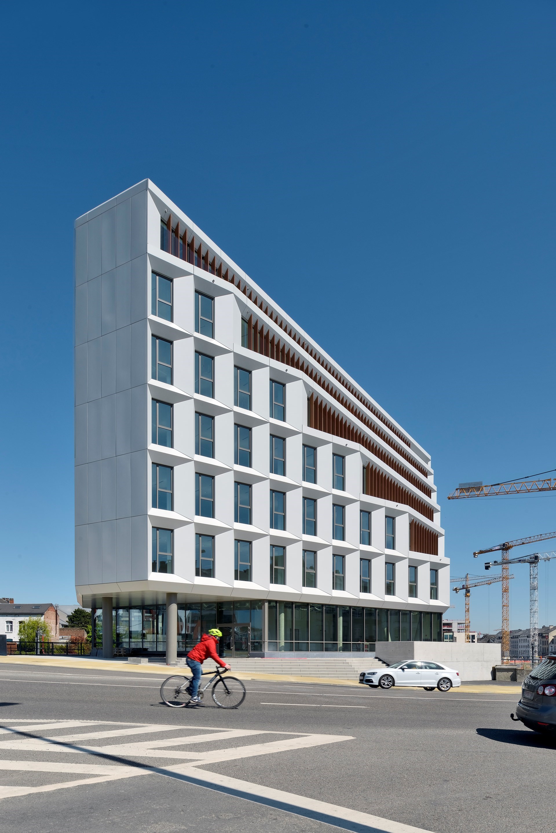 Voor een nieuwe hoofdzetel in Wallonië koos Belfius het opmerkelijke gebouw dat BAEB sprl ontwierp op een site vlakbij het station. De structuur wordt volledig omringd door treinsporen, naast de Boulevard des Combattants. Het betonnen skelet, bestaande uit kolommen, balken en holle vloerelementen, werd volledig off-site vervaardigd. De grote hoeveelheid prefabricage bleek al snel de sleutel om dingen mogelijk te maken, met een aantal onmiskenbare voordelen. Emmanuel Bouffioux en Daniel Martin, van architectenbureau BAEB, geven tekst en uitleg.