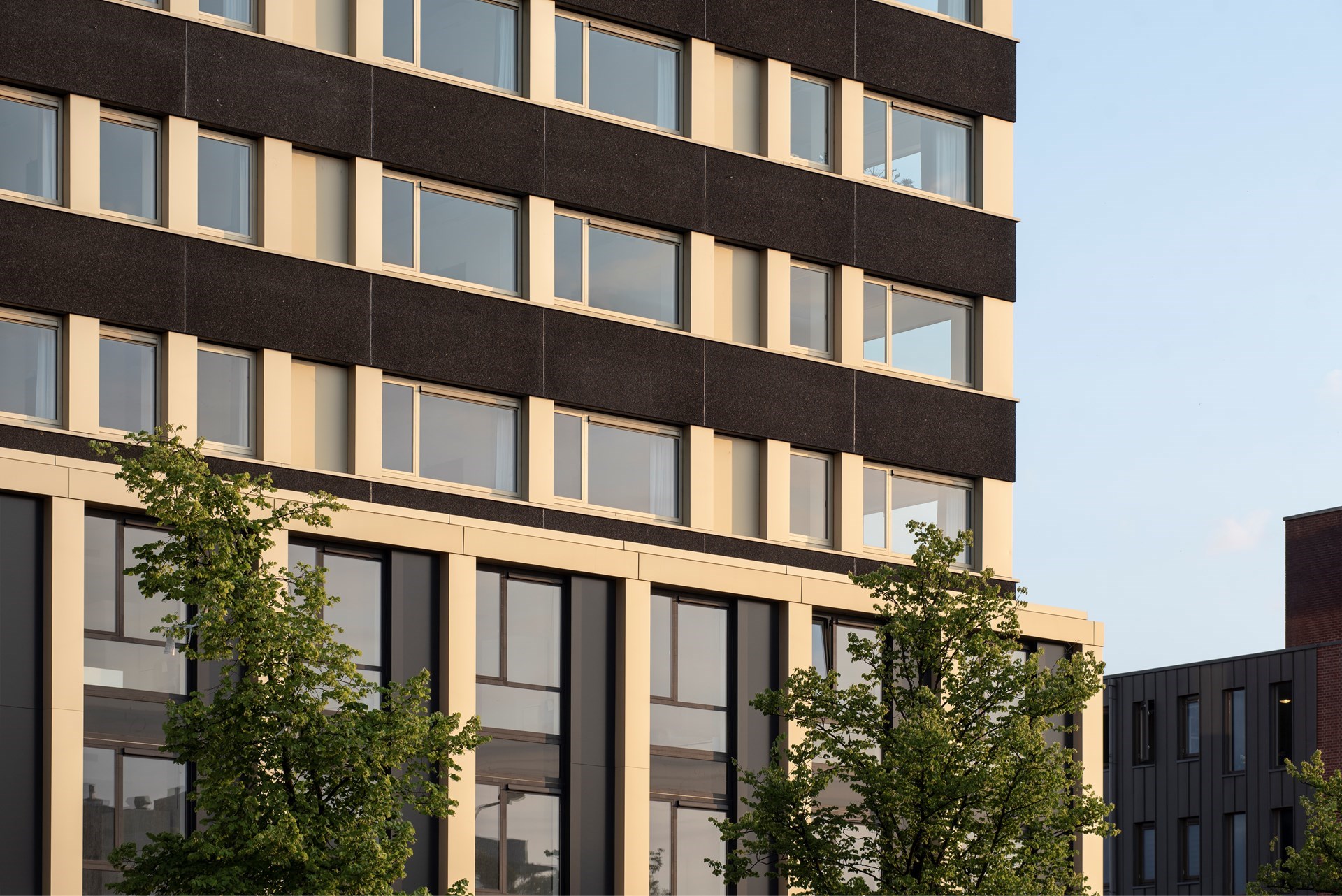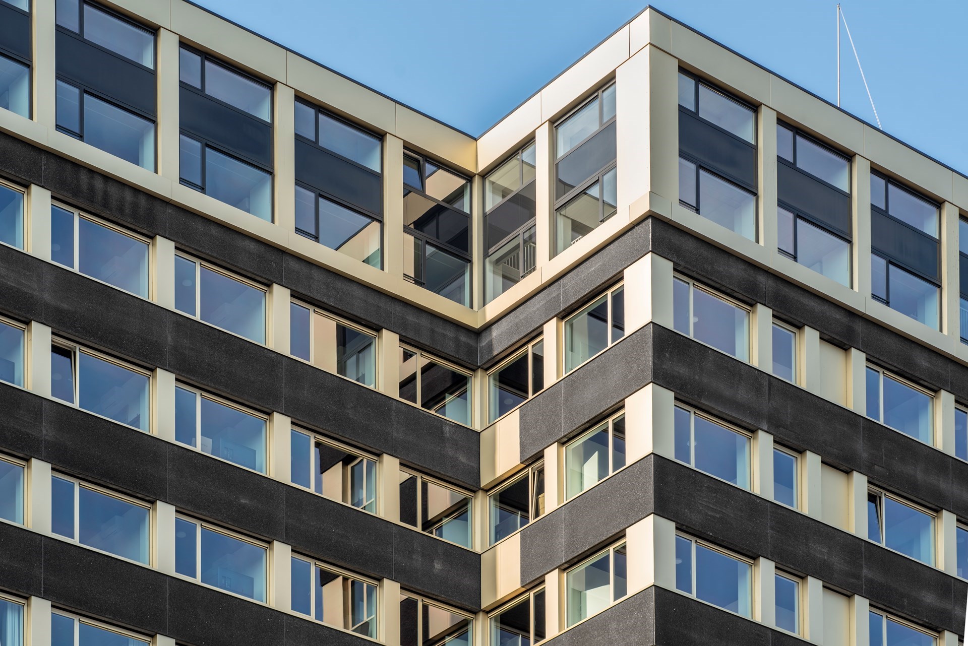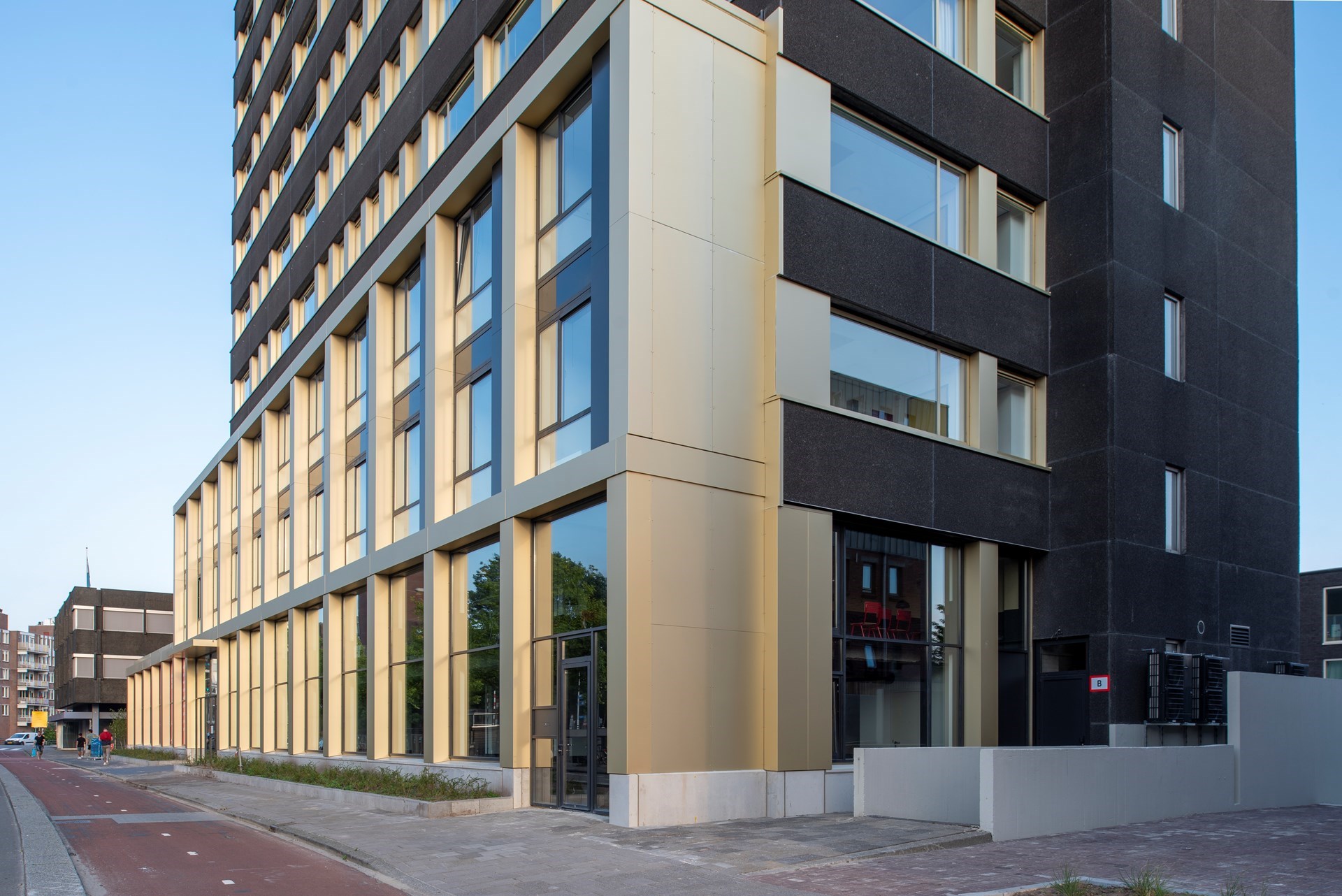 Het in Groningen gekende gebouw ‘de Zwarte Doos’ werd in 1976 door Van Linge & Kleinjan ontworpen als kantoorgebouw. Na een transformatie bevat het complex 300 zelfstandige woningen met multifunctionele ruimtes in de plint. De toevoeging van geanodiseerde, champagnekleurige kozijnen en aluminium penanten van ALUCOBOND® aan de karakteristieken gevelelementen in zwart grindbeton, verlenen de façade een in het oog springend aanzicht.