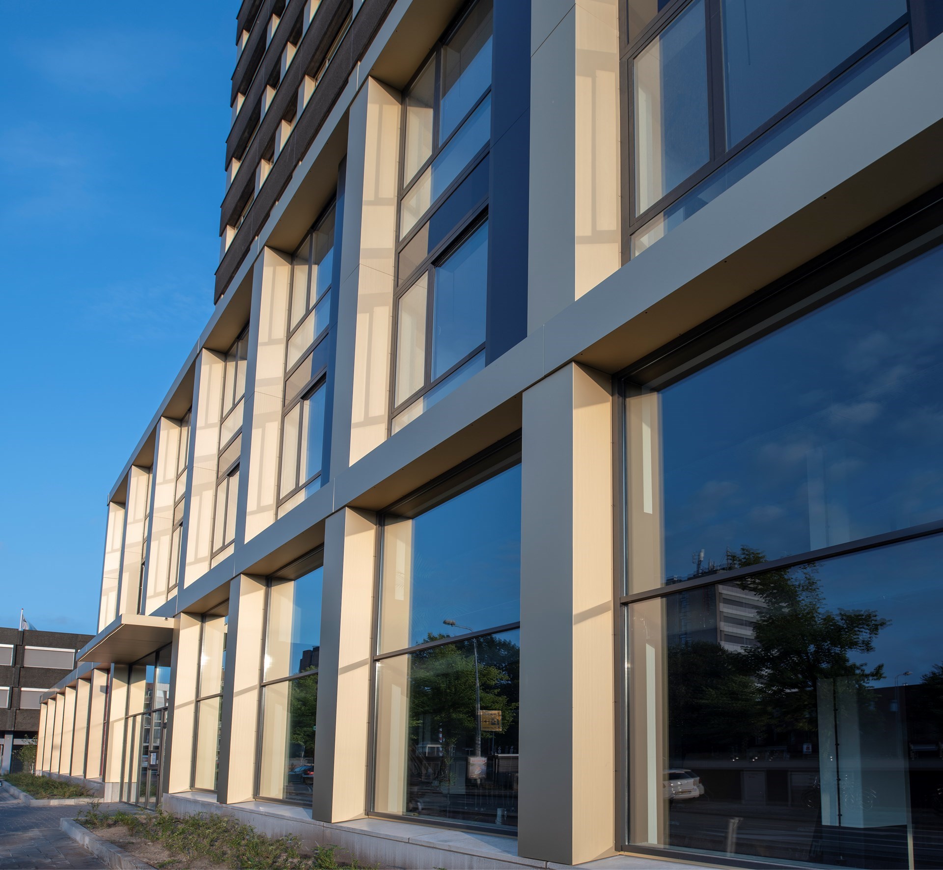 Voor het opmerkelijke gevelontwerp koos Team 4 Architecten een product uit het nieuwe gamma Premium Anodised van ALUCOBOND®, in de kleur matt Alugold 01. Waar de fabrikant voorheen alleen producten aanbood met een gelakte afwerking, al dan niet met een oppervlaktestructuur, behoren dankzij het nieuwe Premium Anodised-gamma ook materialen met een geanodiseerde bovenplaat tot de mogelijkheden. Het speciale kleurenspectrum varieert van natuurlijk geanodiseerd, goud en koper tot donkere tinten in matte of geborstelde afwerkingen.