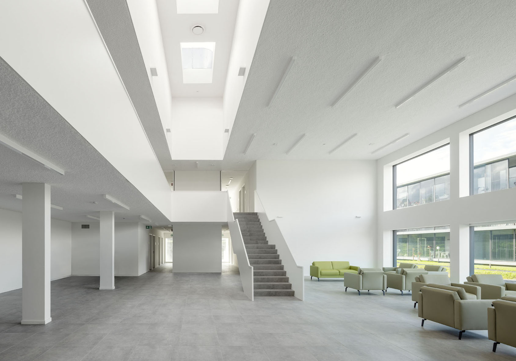 De ramen bestaan uit identieke elementen met antracietkleurige, geanodiseerde aluminium profielen en donkergrijze schermen. Ook het interieur van het gebouw is vrij eenvoudig ontworpen. Terwijl de vloer op de begane grond uit tegels bestaat, wordt verder overal goedkoop PVC gebruikt. Ook de dakramen zijn van kunststof en de plafonds zijn voorzien van akoestisch gespoten stucwerk. De trapleuningen in de binnenruimtes zijn gemaakt van witgelakte, gelaste stalen panelen.