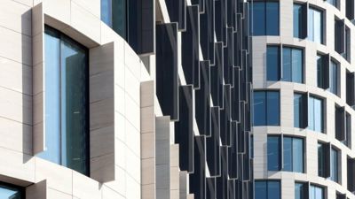Er zijn heel wat inspanningen geleverd om de ecologische voetafdruk van het Quatuor-project te minimaliseren. Het hoeft dan ook niet te verwonderen dat het ontwerp van Jaspers-Eyers Architects bekroond werd met een BREEAM Outstanding-certificaat. “Quasi alle toegepaste materialen zijn recycleerbaar en/of genereren een minimum aan CO2-uitstoot bij productie en transport. Op enkele inox- en aluminiumaccenten na, zijn de gevels integraal bekleed met natuursteen van inheemse makelij, die verankerd is aan een aluminium draagstructuur. Het gepoedercoate aluminium schrijnwerk is ingevuld met driedubbele beglazing”, legt Fabian Sinapi uit. “Ook op het vlak van technieken is niets aan het toeval overgelaten”, pikt Gilles Bollens in. “Zo zijn er meer dan 1400 zonnepanelen geplaatst op de daken en hebben we decoratieve zonnecellen geïntegreerd in de zuid-, west- en oostgevels, in de vorm van verticale vinnen. Bovendien versterken deze vinnen de volumewerking en dragen ze bij tot de algemene esthetiek. Geothermische installaties staan in voor verwarming en koeling. Eveneens het vermelden waard zijn het regenwaterrecuperatiesysteem en de daktuinen boven op de sokkel tussen de volumes. Tot slot is 30 % van de ondergrondse parkeerplaatsen uitgerust met een laadpaal voor elektrische voertuigen. Dit alles maakt van Quatuor een echt voorbeeldproject. Hoewel het gebouw nog niet volledig klaar is, is het resultaat nu al magnifiek!”