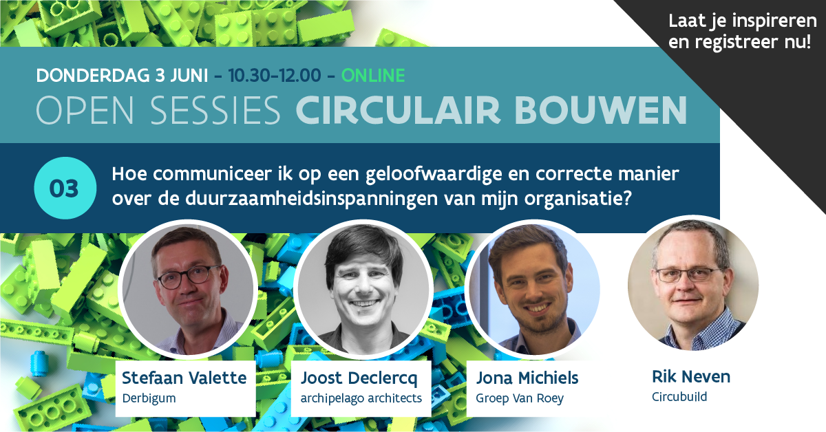 Elk bedrijf beweert duurzaam en circulair te zijn. Circulariteit dreigt daardoor meer en meer een hol begrip te worden en greenwashing komt zo al snel om de hoek loeren. Hoe kan je als bedrijf dat daadwerkelijk inzet op duurzaamheid en circulariteit in je communicatie dan nog het verschil maken? En hoe doe je dat (niet) op een correcte en geloofwaardige manier? Circubuild hield daar samen met Vlaanderen Circulair een enquête rond onder de leden van de Green Deal Circulair Bouwen en andere bouwprofessionals die begaan zijn met circulair bouwen en het is op basis van die resultaten dat het panelgesprek zal worden gevoerd. Het panel werd zo samengesteld dat zowel architecten, aannemers als fabrikanten vertegenwoordigd zijn.