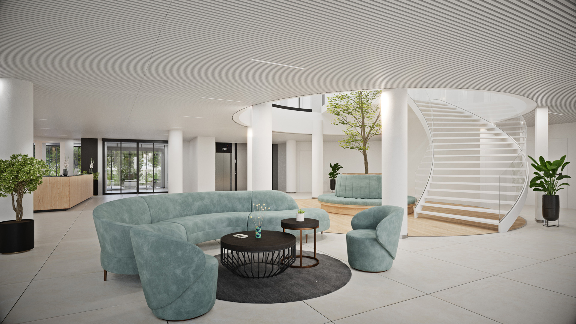 Om de ruimte openheid te geven en het binnenkomen aantrekkelijker te maken, wordt in de hoofdinkom bewust doorzicht gecreëerd. De voorgevels van de inkompartijen worden volledig beglaasd met vliesgevels en achter de hoofdinkom wordt een dubbelhoge vide gemaakt, waarin een deel van de oorspronkelijke ronde vorm van de vloerplaten behouden blijft als subtiele herinnering aan het vroegere gebouw.