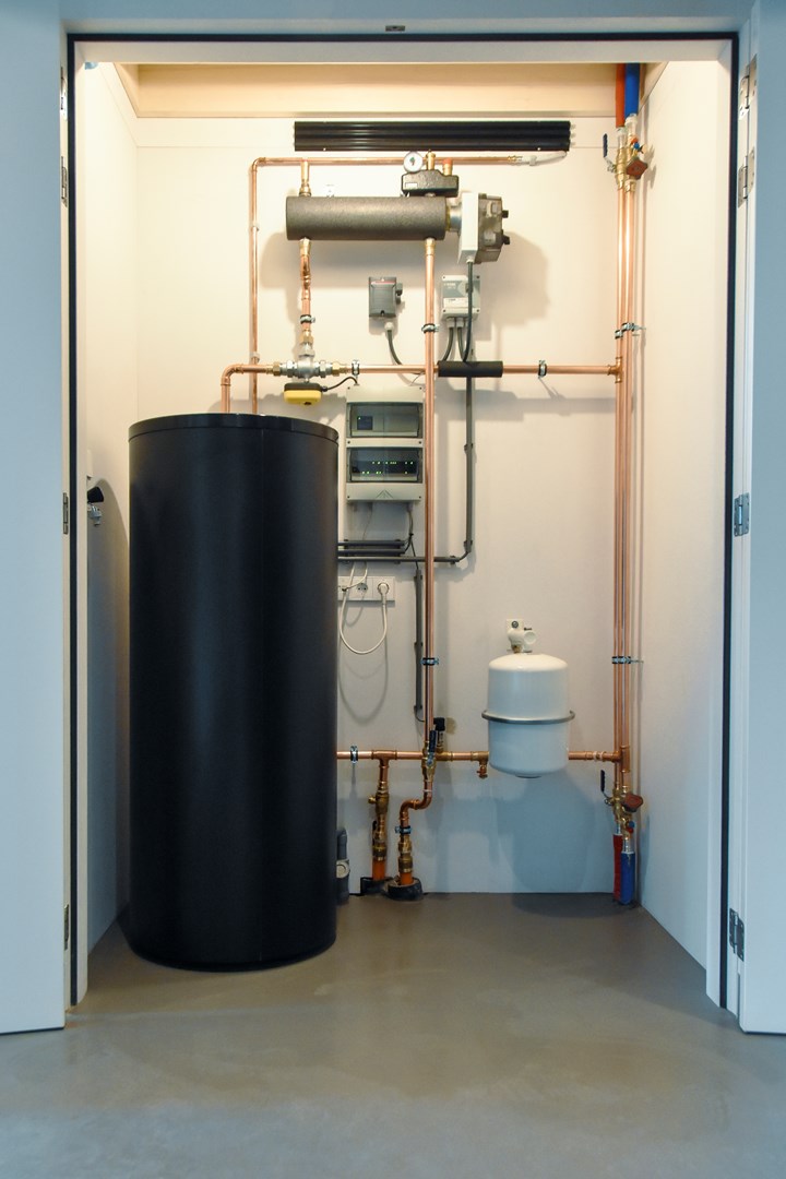 In collectieve woonprojecten voorziet een Renson Cygna warmtepompboiler elke wooneenheid apart van sanitair warm water. De water-waterwarmtepomp boost de restwarmte uit het cv-circuit tot 65°C en buffert dat warme water in een ingebouwde tank van 200 liter. De Renson Cygna verbruikt tot vijf keer minder dan een klassieke elektrische boiler en bespaart zo tot 80 % energie, goed voor een A+ energielabel. Door in de zomer het water van het circuit – dat afkoelt bij de aanmaak van sanitair warm water – door de vloerverwarming te sturen, kan je bovendien ‘gratis’ koelen.