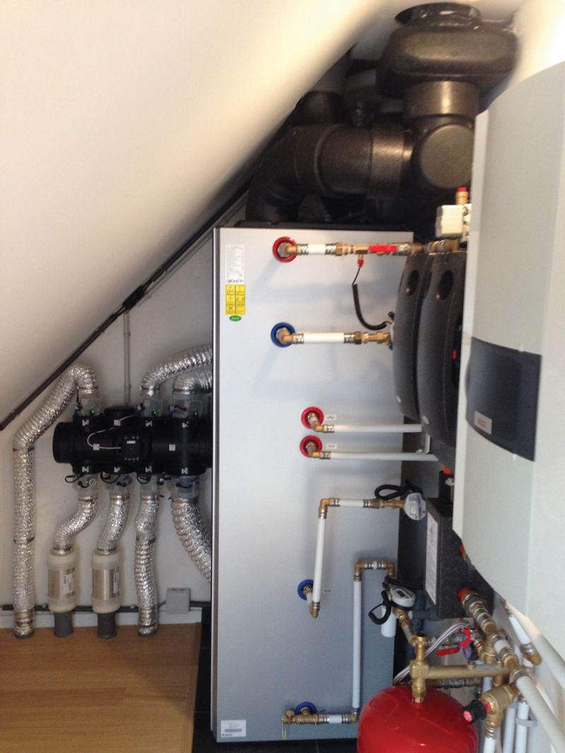 Uniek aan het systeem is dat de warme extractielucht niet onmiddellijk afgevoerd wordt, maar volledig benut wordt voor de ingebouwde warmtepomptechnologie. Als er geen vraag is naar warmte fungeert Systeem E+ als een vraaggestuurd ventilatiesysteem. Zodra er ruimteverwarming of sanitair warm water gewenst wordt, treedt de geïntegreerde lucht/water-warmtepomptechnologie in werking. De warmtepomp brengt de warmte uit de menglucht (warme afvoerlucht/ koudere buitenlucht) naar een hoger temperatuurniveau en benut die warmte voor ruimteverwarming (via een platenwarmtewisselaar) en sanitair warm water (via een spiraal rond het boilervat). Het systeem omvat eveneens een buffervat van 300 liter (4 à 6 personen) voor het sanitair warm water. Wanneer de vraag naar warmte op een bepaald moment hoger is dan wat de warmtepomp kan aanbieden, komt automatisch een klassieke gascondensatieketel in actie. Een ingebouwde ‘Energy Analyser’ zorgt ervoor dat telkens de meest voordelige energiebron gekozen wordt.