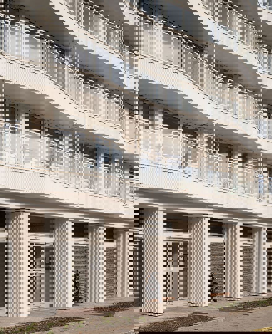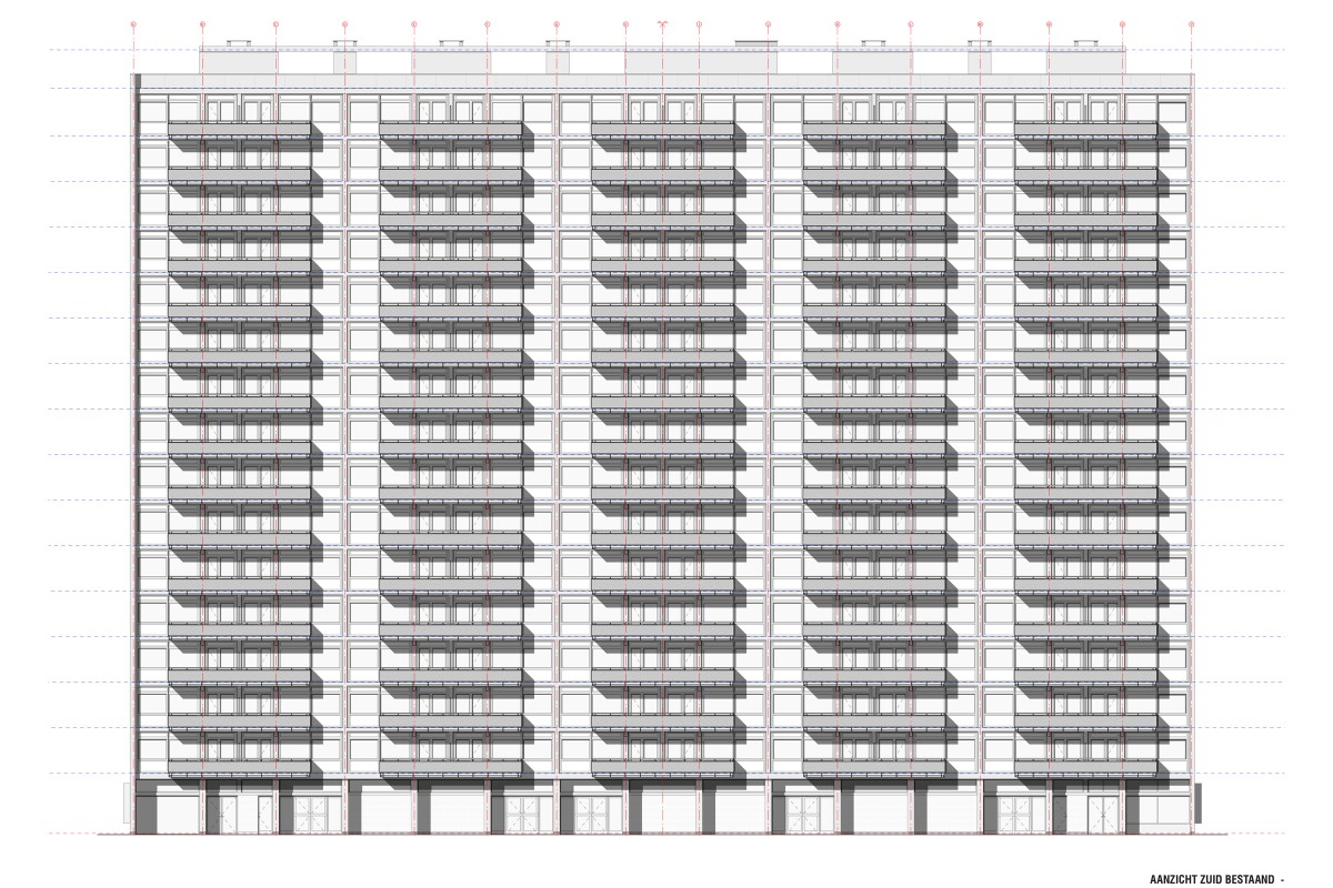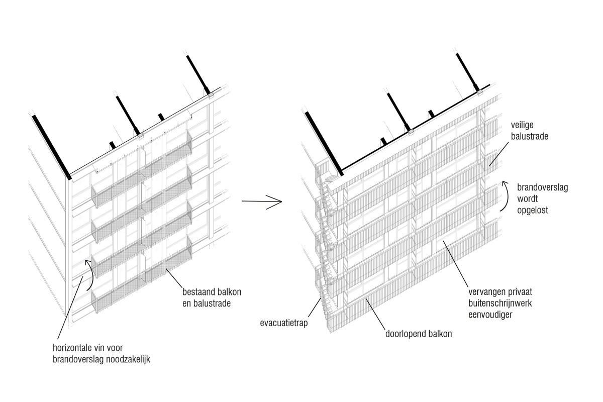 Aansluitend op het eerder goedgekeurde renovatiemasterplan werd Gevelinzicht aangesteld voor de terras- en gevelrenovatie van drie gevels, met Bollinger+Grohmann als structureel adviseur. De bestaande terrassen werden vervangen en uitgebreid, wat de bruikbaarheid en de leefkwaliteit van de appartementen aanzienlijk verhoogde. Daarnaast werden twee nieuwe buitenvluchttrappen toegevoegd, die zorgen voor een duidelijke verbetering van de brandevacuatie.