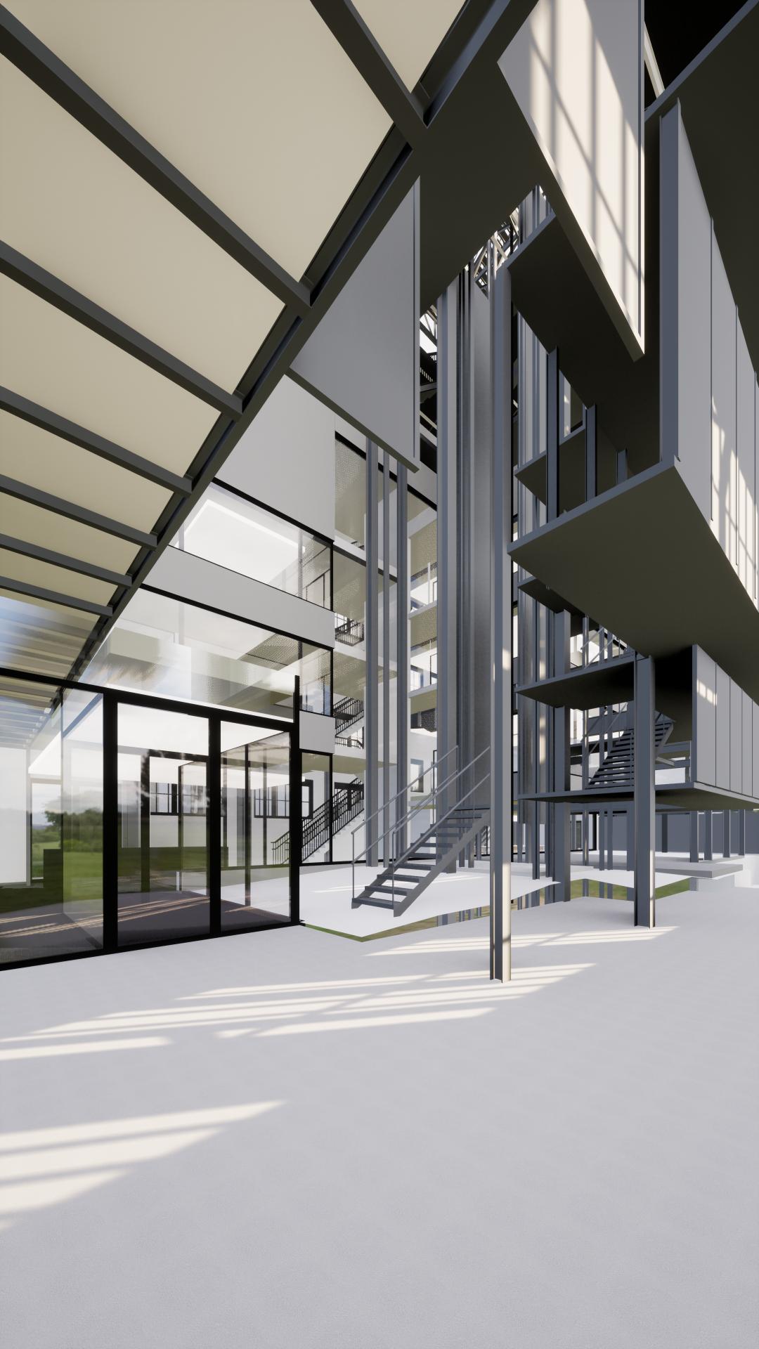 - De implementatie van een glazen lift en een nieuwe stalen trap tussen het nieuwe gebouw onderaan en aan de top van de schachtbok