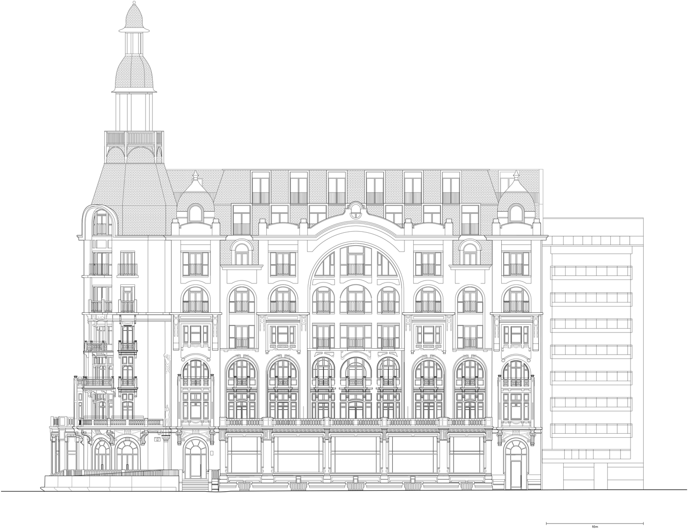 Chipperfield kijkt naar de geschiedenis van The Grand, zorgt voor de onderscheidende kwaliteiten en begrijpt de noodzaak van het voortbestaan in de toekomst. Het overgebleven historische weefsel zal zorgvuldig worden gerestaureerd, zoals de entree en de originele gevelelementen. De appartementen op de bovenste verdiepingen zullen de oorspronkelijke structuur van het hotel respecteren. Verloren elementen, zoals de toren en de koepels, worden in ere hersteld, waarbij inspiratie wordt geput uit het speelse oorspronkelijke ontwerp.