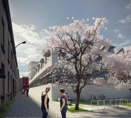 Het Rijksarchiefgebouw wordt gekenmerkt door een sterk blokvormig volume. De verhoogde inkomzone fungeert als sokkel van het nieuwe gebouw, terwijl de in glas uitgevoerde gevel zich richt naar de nauwe straatjes in de omgeving en de omwonenden een inkijk biedt in de werking van het Rijksarchief. Naast de Jeruzalemstraat zal een klein, stedelijk plein gerealiseerd worden. Enkele bomen en zitbanken zorgen voor een open sfeer in dit dichtbebouwde woongebied. Tijdens de kantooruren kan het plein gebruikt worden als parkeerplaats voor het personeel van het rijksarchief en andersvaliden.