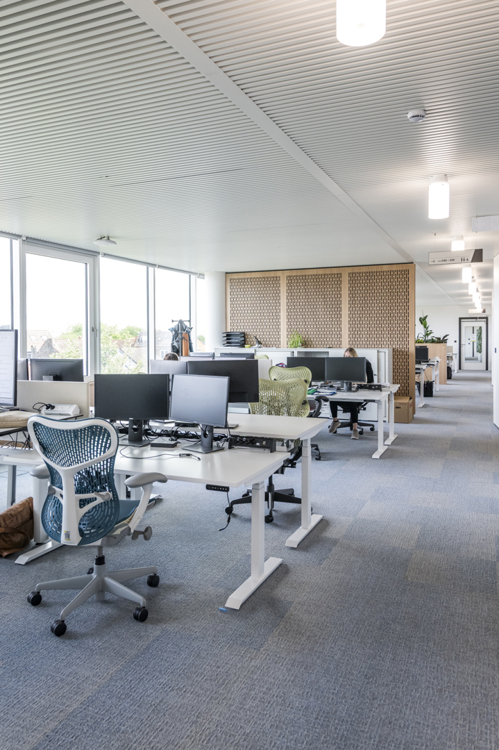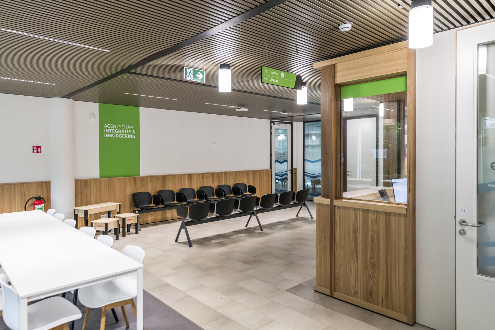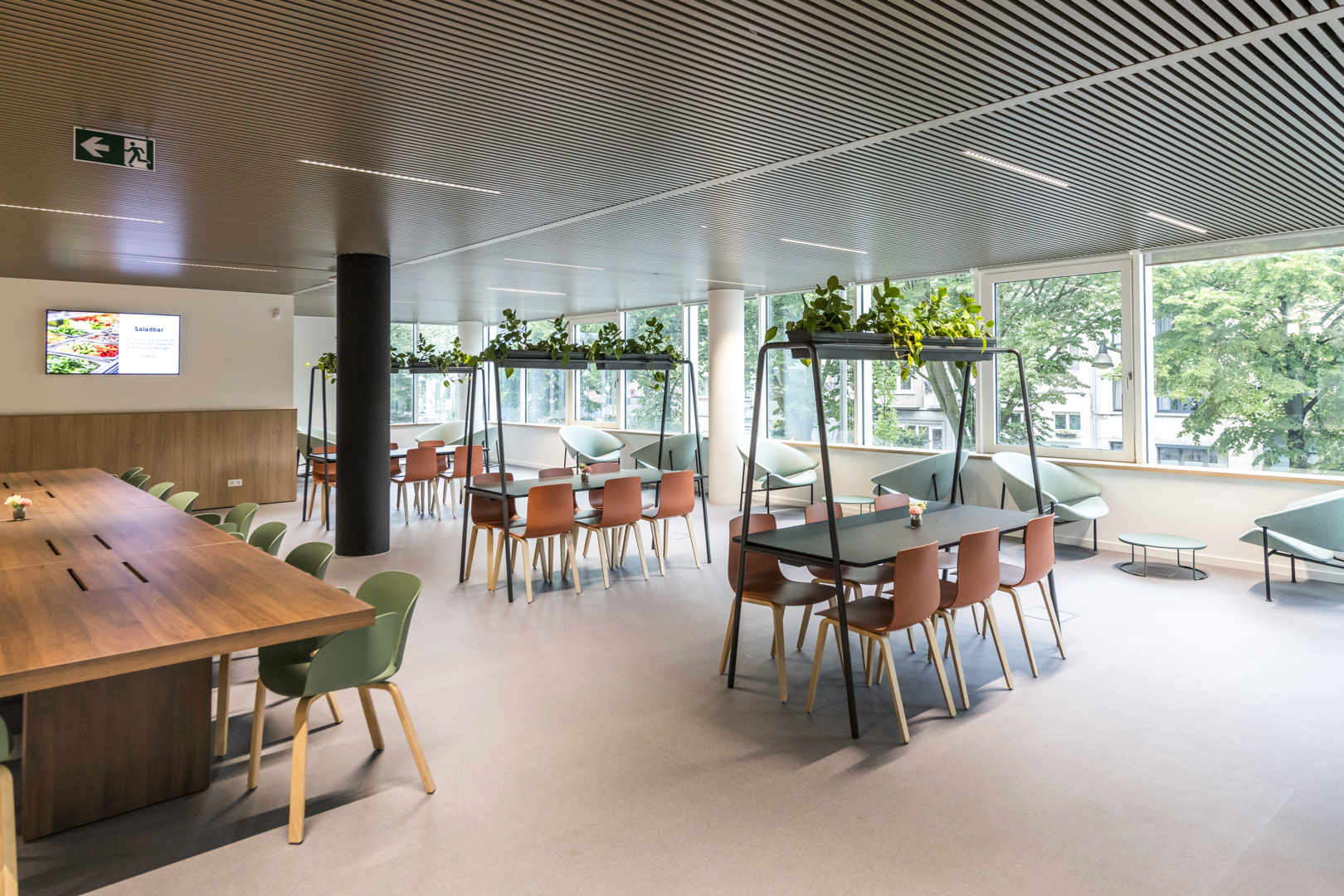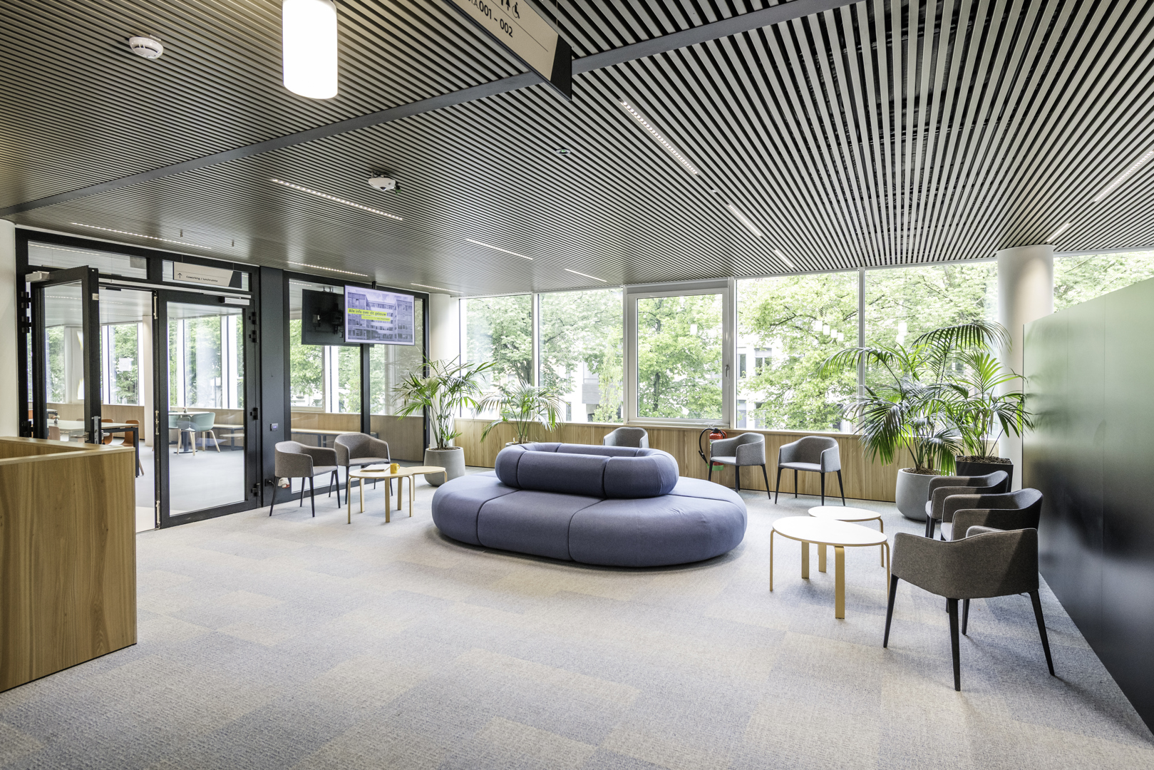 De nieuwe kantoorinrichting werd gebaseerd op het principe van hybride werken: de verschillende verdiepingen zijn opgedeeld in zones exclusief voor de verschillende entiteiten en in diverse gedeelde zones, beschikbaar voor iedereen die in het gebouw werkzaam is.