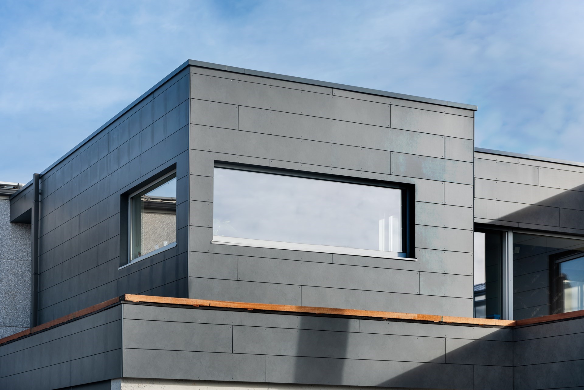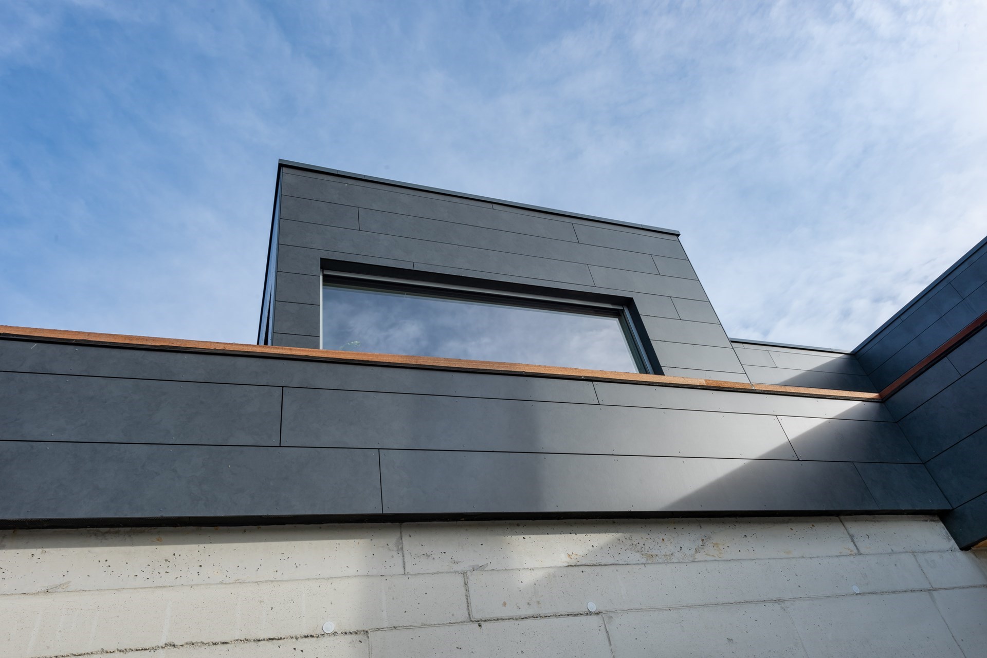 “De eigenaars verkozen als gevelafwerking een duurzaam product maar het mocht niet te kil en te modern ogen. Er zijn heel wat gevelmaterialen de revue gepasseerd, maar bij Rockpanel vonden ze meteen hun gading door de mooie schakeringen in het paneel die zorgen voor een moderne uitstraling.”, vertelt architect Elke Vonck.