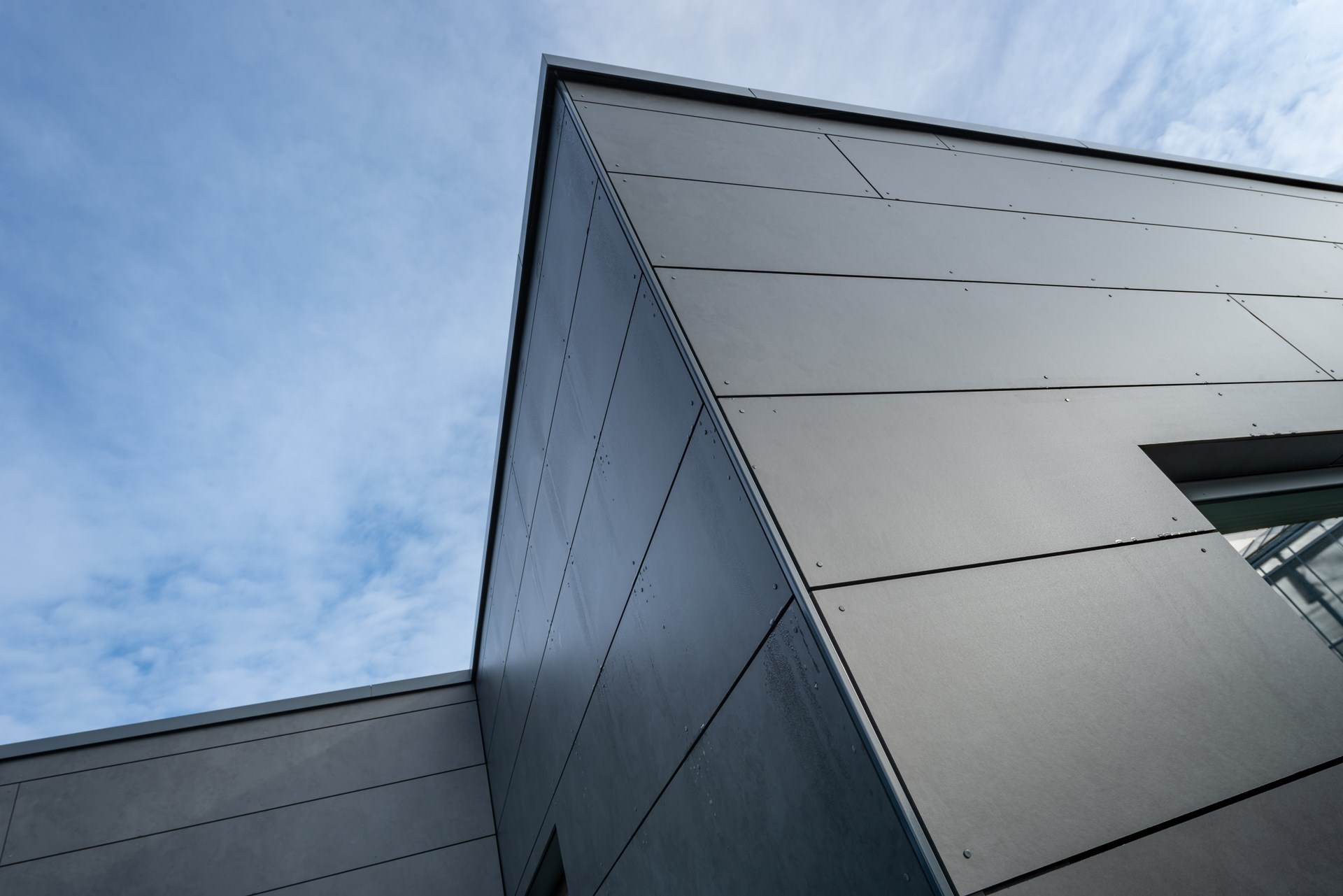 “We plaatsten de gevelbekleding in horizontale stroken met tussenruimte om zetting van de panelen toe te laten. Ook hielden we rekening met voldoende luchtcirculatie achter de gevelpanelen. Om de look van het gebouw zo strak en modern mogelijk te houden, gebruikte we nagels in dezelfde antracietkleur. Als je vanop een afstandje kijkt naar de gevel zal je dus nauwelijks merken dat de panelen met nagels bevestigd zijn.”