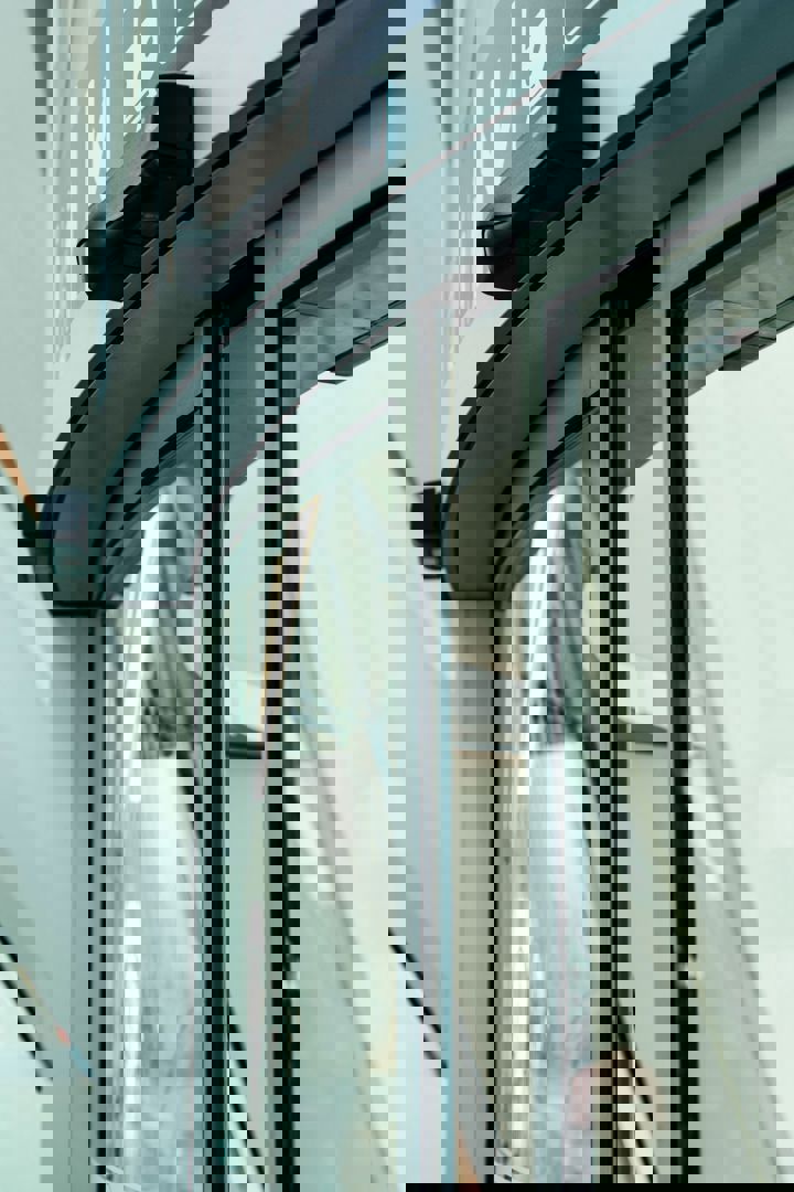 De rondschuifdeuren van GEZE zijn uitgerust met de slanke Slimdrive-aandrijving, discreet weggewerkt in de horizontale stalen steunbalk boven de deur. Dankzij een hoogte van amper 7 cm biedt deze aandrijving een subtiele, bijna onzichtbare oplossing – een belangrijk voordeel voor architecten die streven naar visuele rust.