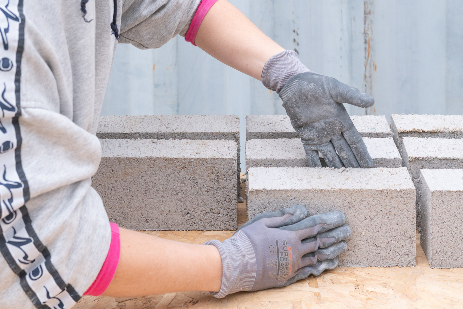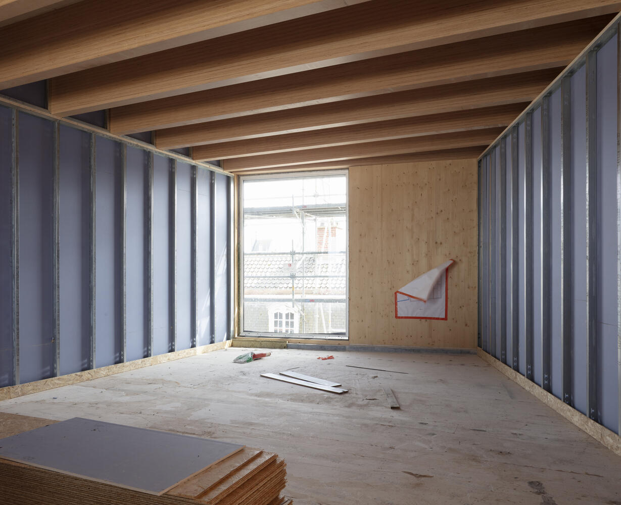 Niet alleen het houtskelet maakt DING duurzaam. Zo ontwikkelde BC materials voor de façade een circulaire gevelsteen op basis van kalk en gebroken glas en beton afkomstig uit Gents bouwafval. De steen wordt niet gebakken maar geperst en heeft ook daardoor een lagere koolstofvoetafdruk dan nieuwe gevelstenen. Over de circulaire gevelsteen lees je meer in dit artikel dat we eerder brachten.