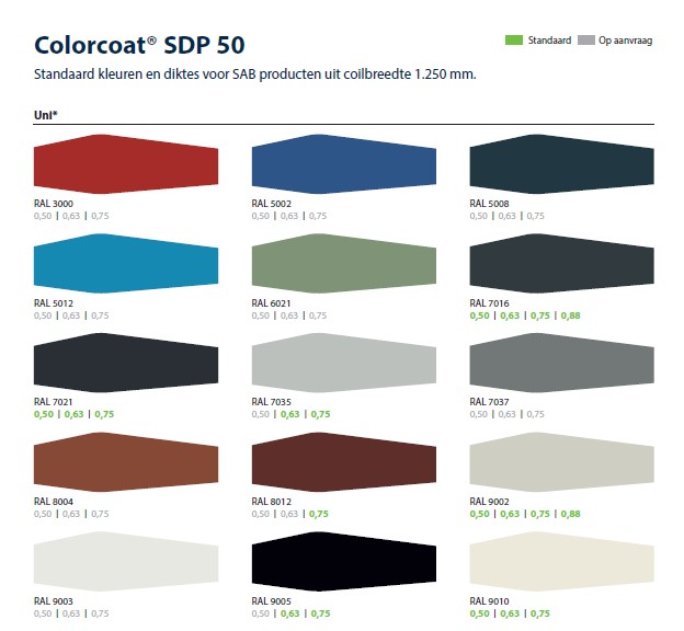 De fabrikant ontwikkelde een nieuwe Colorcoat-brochure waarin ook alle mogelijkheden van de Colorcoat SDP 50 meegenomen werden. De nieuwe brochure geeft een overzicht van diverse mogelijkheden, toepassingsadviezen en (standaard) kleuren en diktes voor Colorcoat® bij SAB, van Colorcoat® PE 25, Colorcoat® SDP 50 tot Colorcoat Prisma® en Colorcoat HPS200 Ultra®. Alle coatings en kleuren staan bij elkaar in een handig overzicht.
