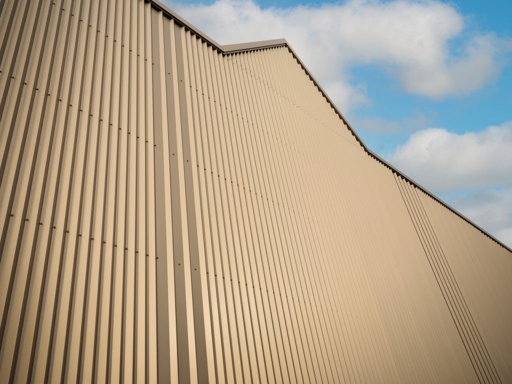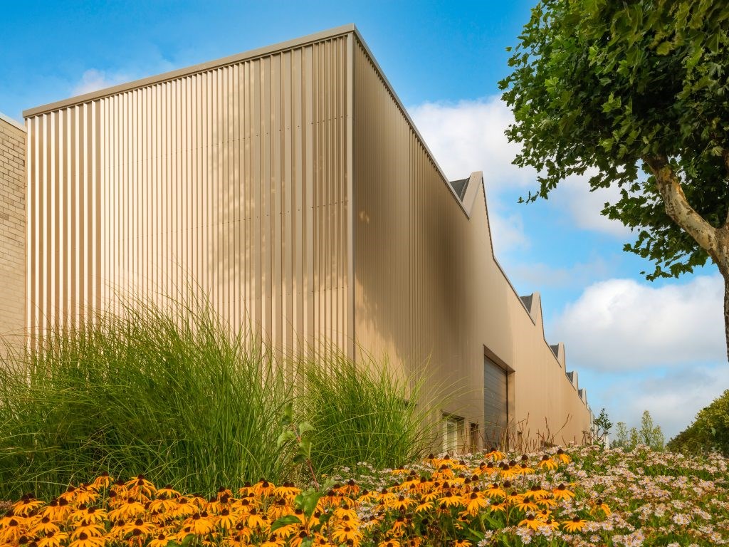 Voor de buitengevel is gekozen voor het duurzame Colorcoat® SDP 50 in de nieuwe kleur Dubai Desert. Dit goudkleurige metallic materiaal vangt prachtig het zonlicht, versterkt door het lijnenspel van de SAB-Pyramid profielen, wat zorgt voor een sprankelende façade.