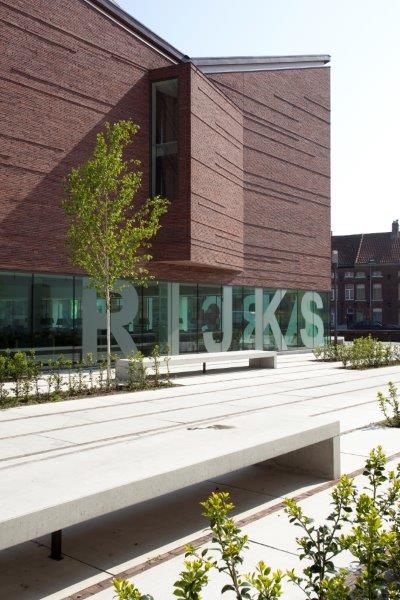 De gelaagdheid van de gevels is ook terug te vinden in de lineaire opbouw van de buitenaanleg. Langwerpige, lichtkleurige elementen in architectonisch beton worden afgewisseld met stroken kleiklinkers en groen met bomen, welke verwijzen naar de voormalige kruidentuinen.