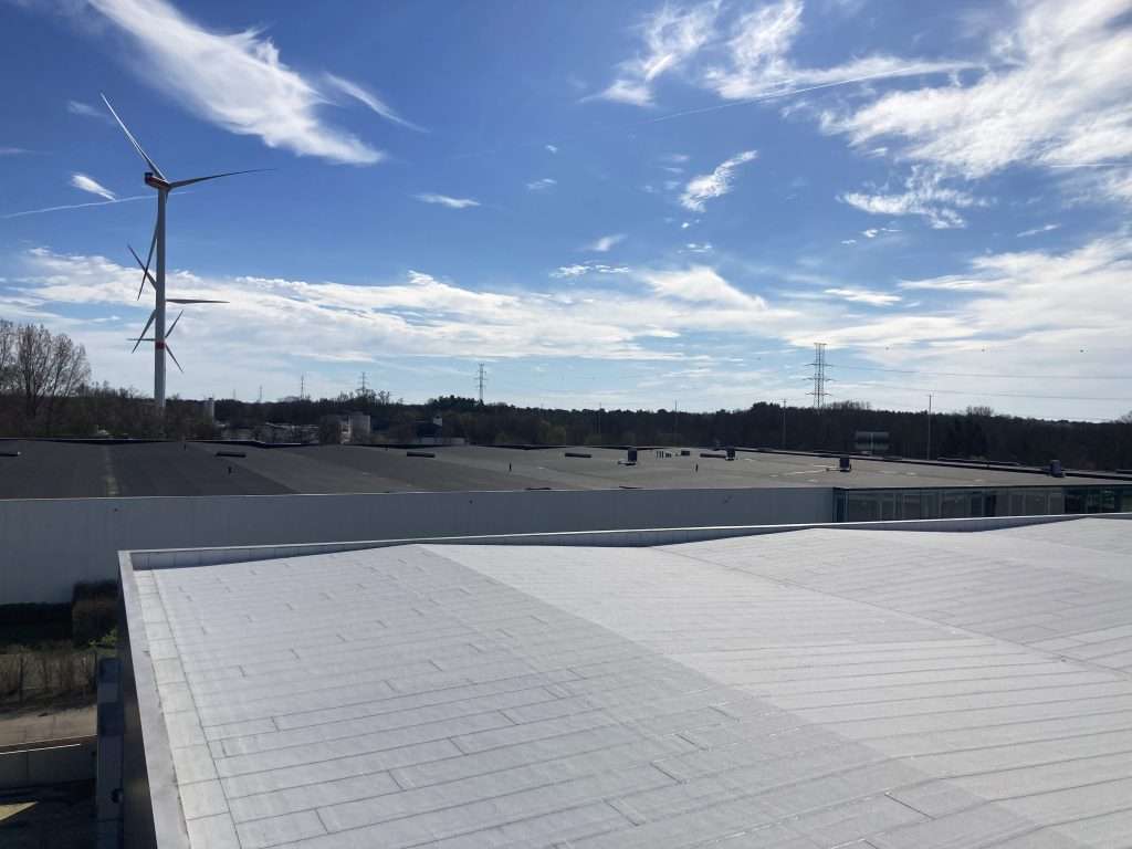 Dat laatste verklaart deels waarom de keuze voor de Derbicolor NT Patch-dakbanen ook duurzaam was. De duurzaamheid schuilt daarnaast in het feit dat de Derbicolor NT Patch-dakmembranen een verwachte levensduur van vijftig jaar hebben en aan de binnenkant bestaan uit zogenaamd Derbitumen, een materiaal dat Derbigum maakt van bitumineus productie- en werfafval en van oude bitumineuze dakbanen, waarvoor het een terugnameprogramma op poten zette. Maar ook de banen op hun beurt voor de volle 100% recycleerbaar zijn en geproduceerd worden met 100% groene stroom, maakt de Derbicolor NT Patch-dakbanen tot een duurzame keuze.