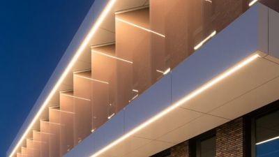 Daarnaast moest het gebouw de verschillende bestaande werkplaatsen verbinden en een geheel vormen met het hoofdkantoor van de groep Van Roey, dat ernaast ligt. Daarom werd net als voor het kantoorgebouw van Van Roey gebruik gemaakt van verticale, glazen lamellen met een koperkleurige doek, die de zon buiten houden en tegelijk het uitzicht naar buiten vrijwaren. Bij zonsondergang krijgt de gevel een warme, koperen gloed. Verder verwijzen de rode bakstenen van Petersen naar het vakmanschap dat ook bij Staalbeton primeert. De baksteen zien we ook terug in de patio.