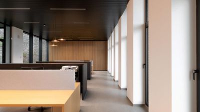De open, hoge ruimtes in de kantoren geven de werknemers weer ruimte. Vergaderen kan in verschillende delen van het gebouw zowel op formele als informele manier. Het geheel ademt rust uit en dat biedt een aangenaam tegenwicht voor de hectiek die soms heerst in de omliggende productieomgeving.