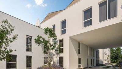 Het hoofdvolume dringt tot in het binnengebied door. Aan de noordzijde leidt het nieuwe voetgangerssteegje naar de verschillende ingangen en de gemeenschappelijke tuin. Aan de zuidkant genieten de privétuinen en -terrassen van de appartementen van een overvloed aan zonlicht.