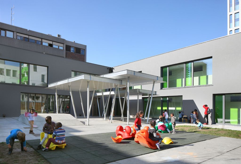 Verder omvat het complex ook een gebouw voor ONE, de Franstalige tegenhanger van Kind & Gezin, en een kinderdagverblijf. En naast de publieke voorzieningen zijn er ook appartementen: 51 units, gaande van studio’s tot appartementen met vier slaapkamers.