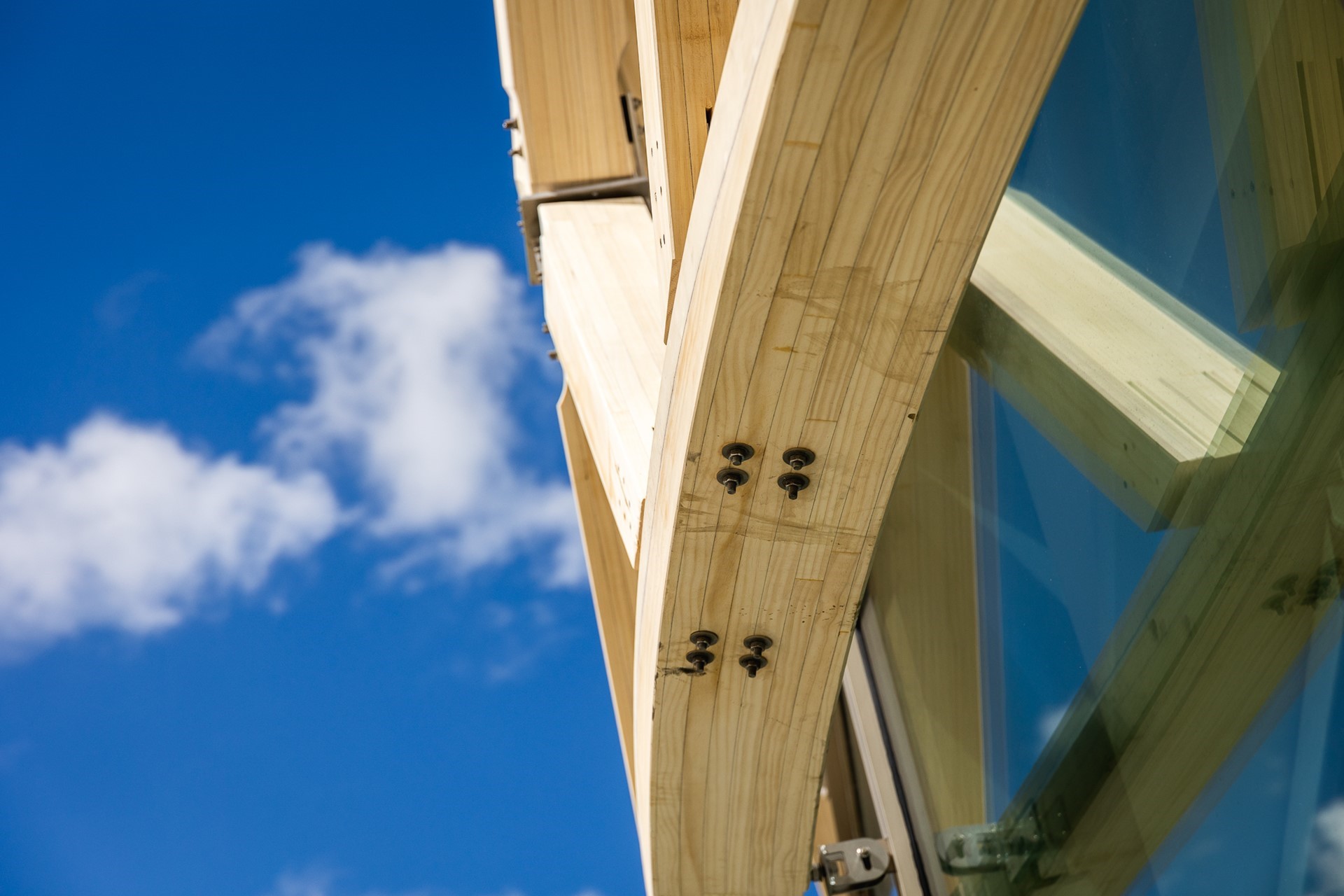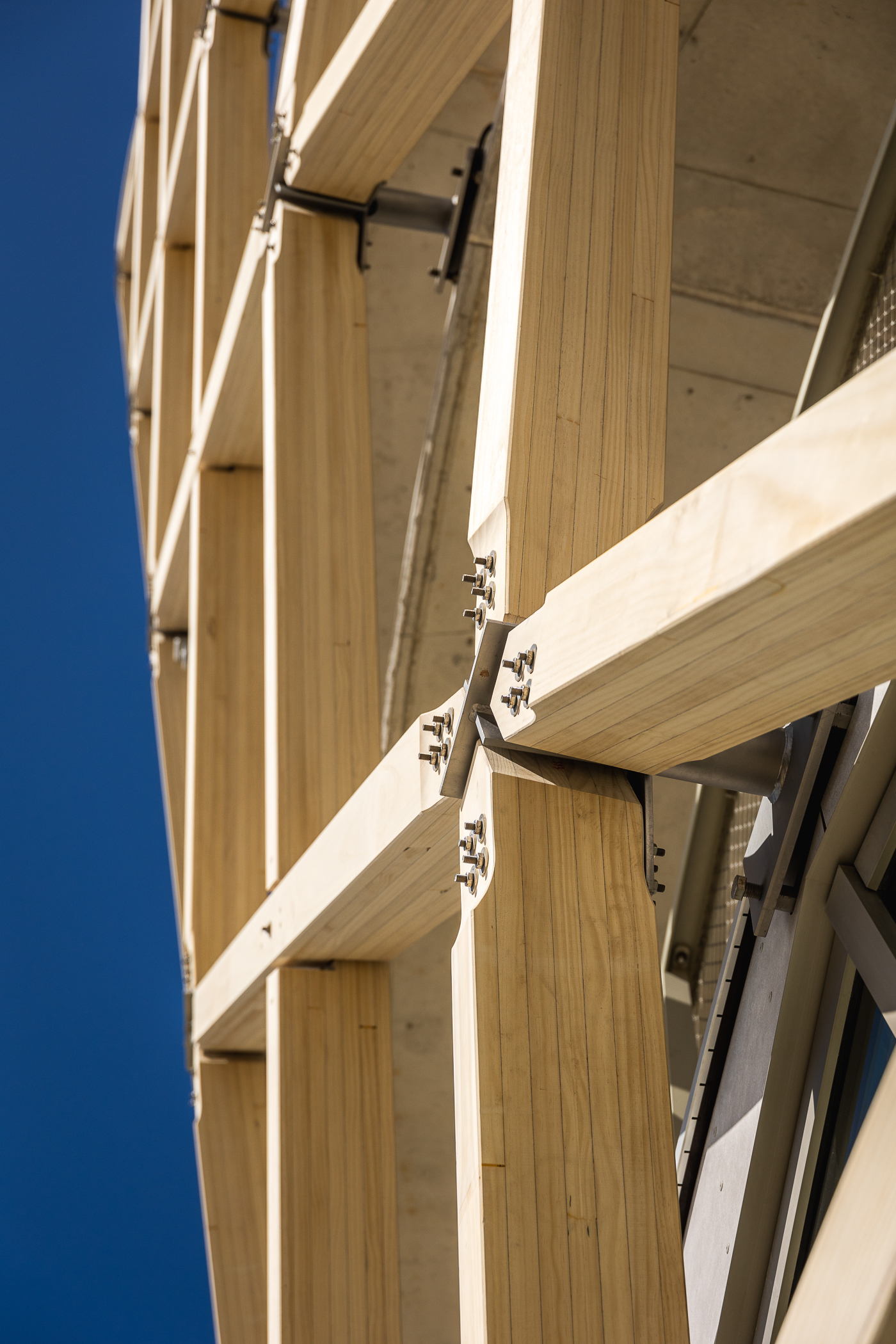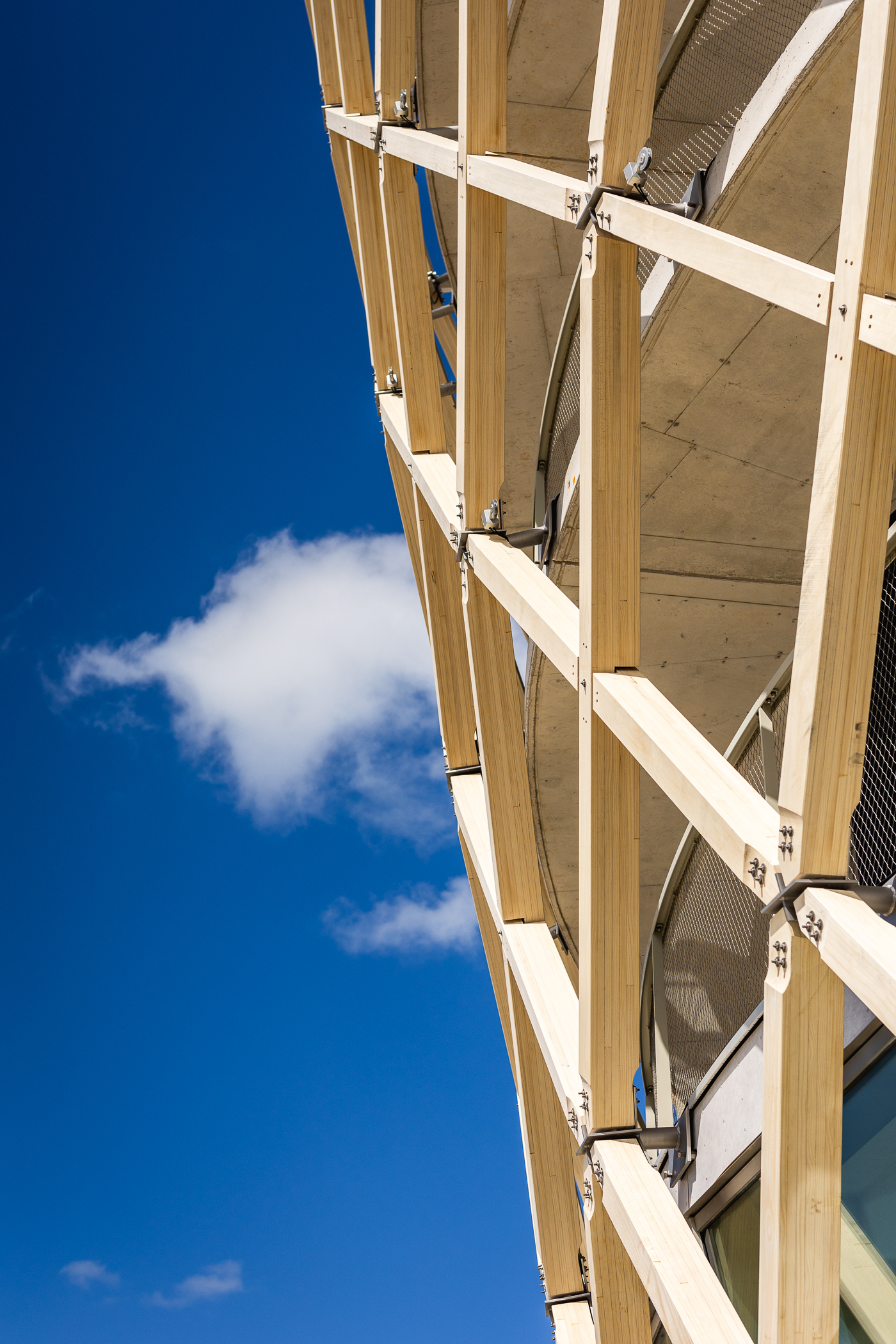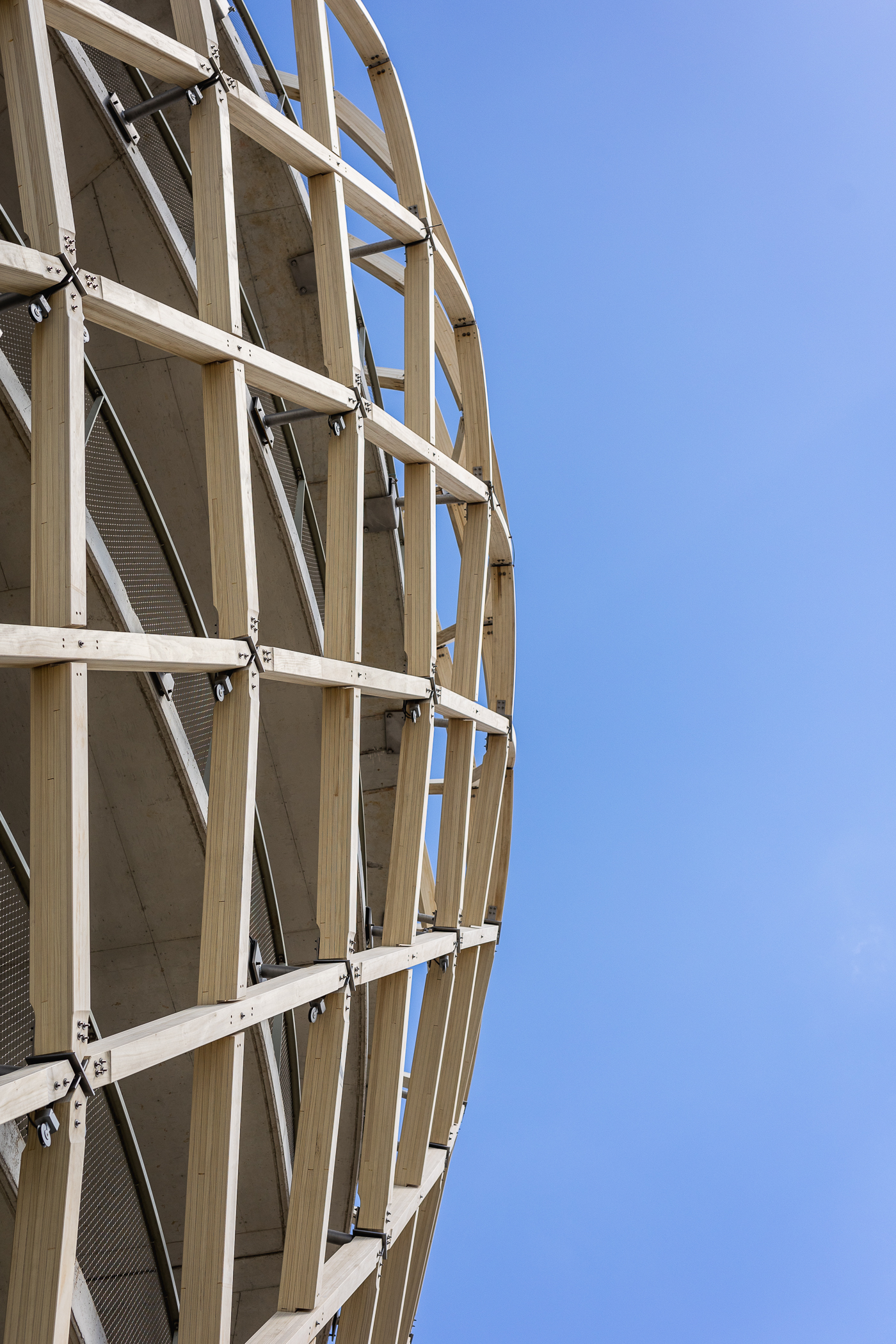 Een andere bijzondere uitdaging was het modelleren en installeren van de overgangszone tussen de gevel en het dak. “De geometrie op die plek vertoont een eenvoudige puntsymmetrie. Dit betekent dat van de 600 houten en 1000 stalen onderdelen slechts twee stuks exact hetzelfde zijn. Identificatie, voormontage en montage… een heus logistiek kluwen. Dat gold eigenlijk voor het gehele bouwproces, van de planning van de productiecapaciteit, het schaven van de ruwe lamellen, het verlijmen van de balk tot het frezen in de CNC-machine en de voormontage van de bevestigingsmiddelen en stalen onderdelen in de fabriek”, geeft HESS TIMBER aan.