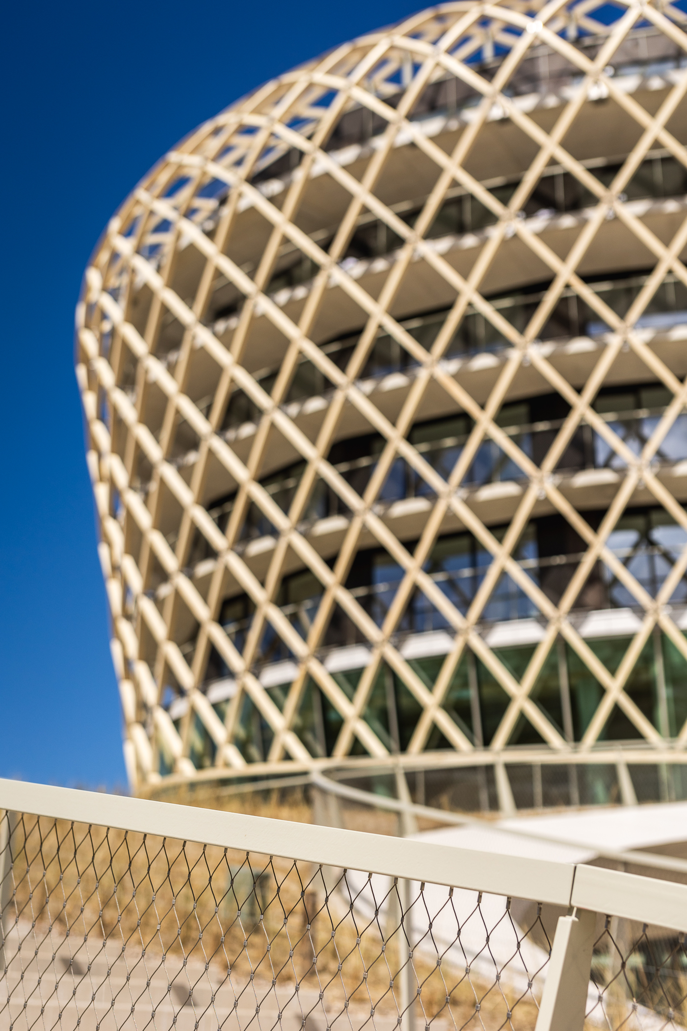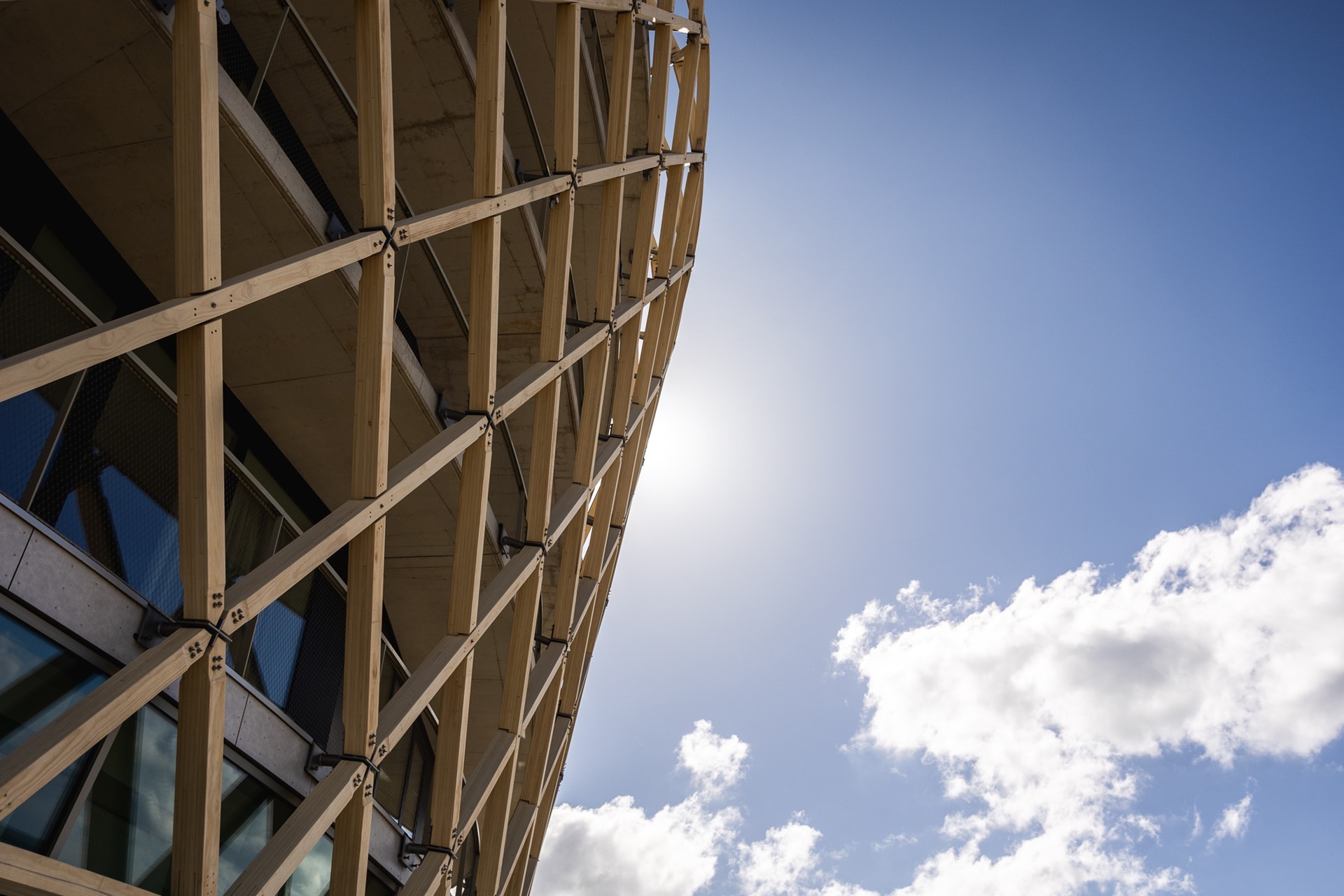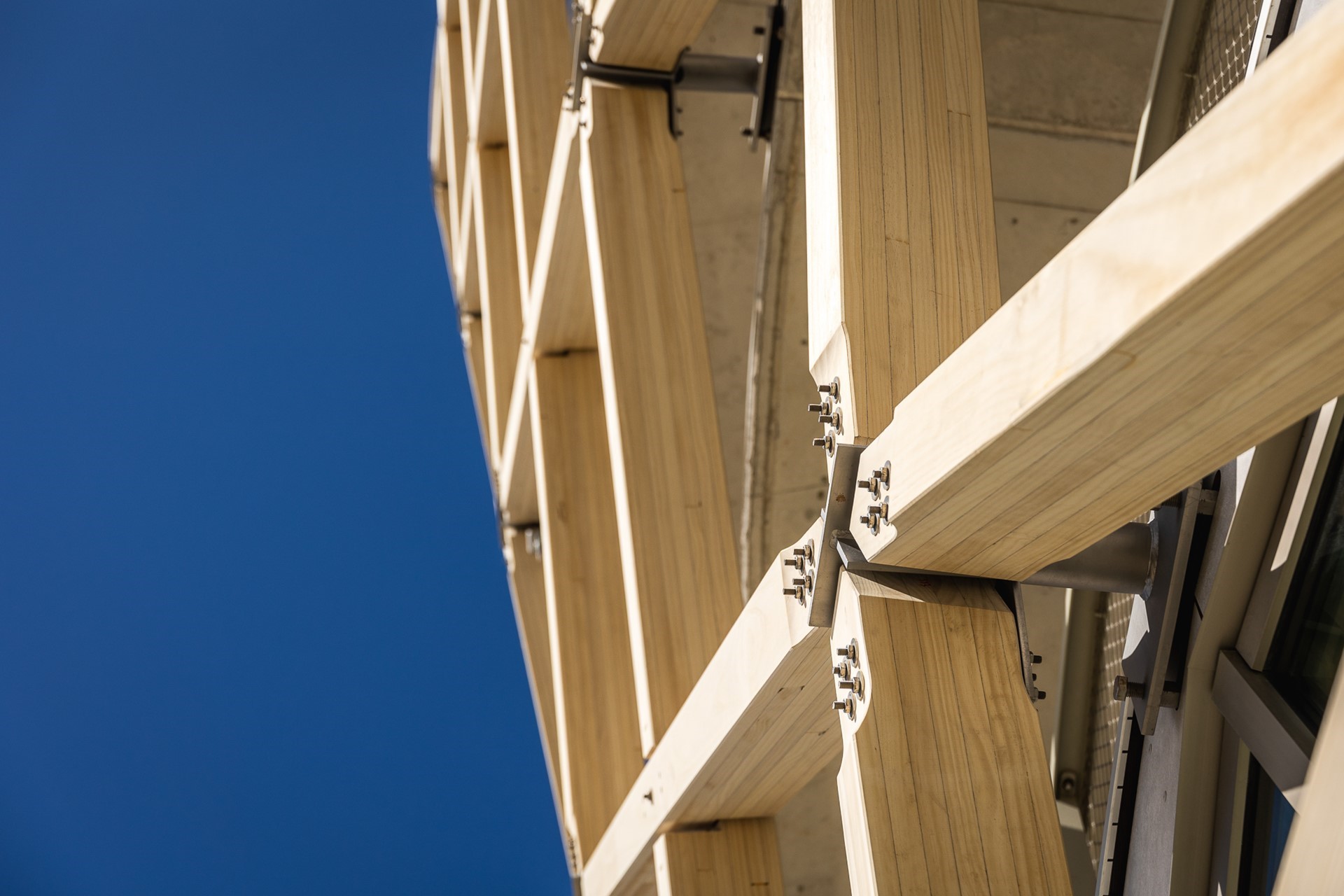 Een andere bijzondere uitdaging was het modelleren en installeren van de overgangszone tussen de gevel en het dak. “De geometrie op die plek vertoont een eenvoudige puntsymmetrie. Dit betekent dat van de 600 houten en 1000 stalen onderdelen slechts twee stuks exact hetzelfde zijn. Identificatie, voormontage en montage… een heus logistiek kluwen. Dat gold eigenlijk voor het gehele bouwproces, van de planning van de productiecapaciteit, het schaven van de ruwe lamellen, het verlijmen van de balk tot het frezen in de CNC-machine en de voormontage van de bevestigingsmiddelen en stalen onderdelen in de fabriek”, geeft HESS TIMBER aan.